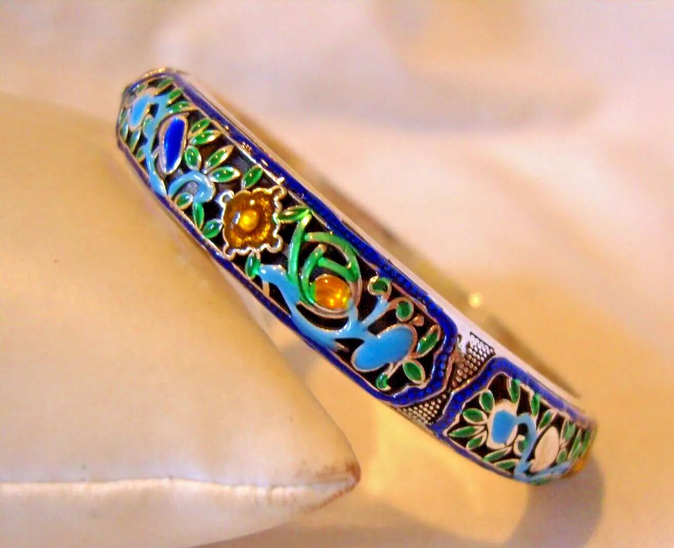 Bracelet Sterling Silver Vintage 1970s Multi Coloured Cloisonne Enamel Bangle 7"L