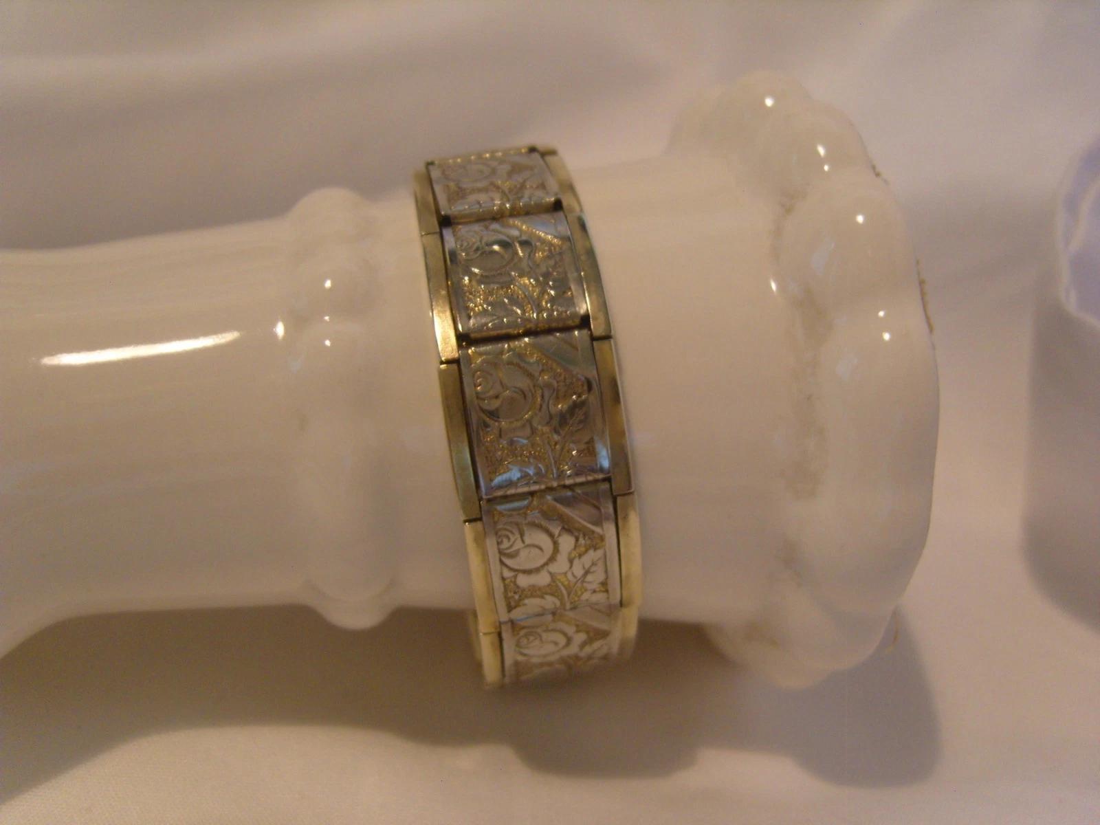 Fabulous vintage WW2 Ladies bright silver nickel Sweetheart expandable panel bangle/bracelet decorated with roses and scroll work.