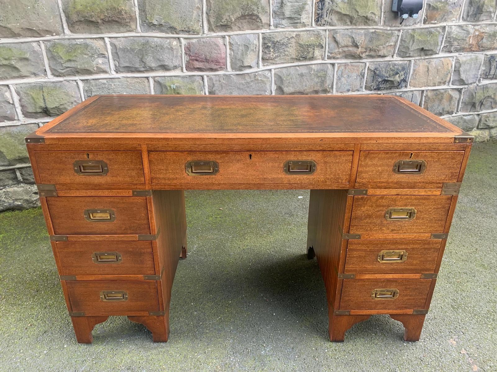 Brass Bound Mahogany Military Campaign Style Pedestal Desk