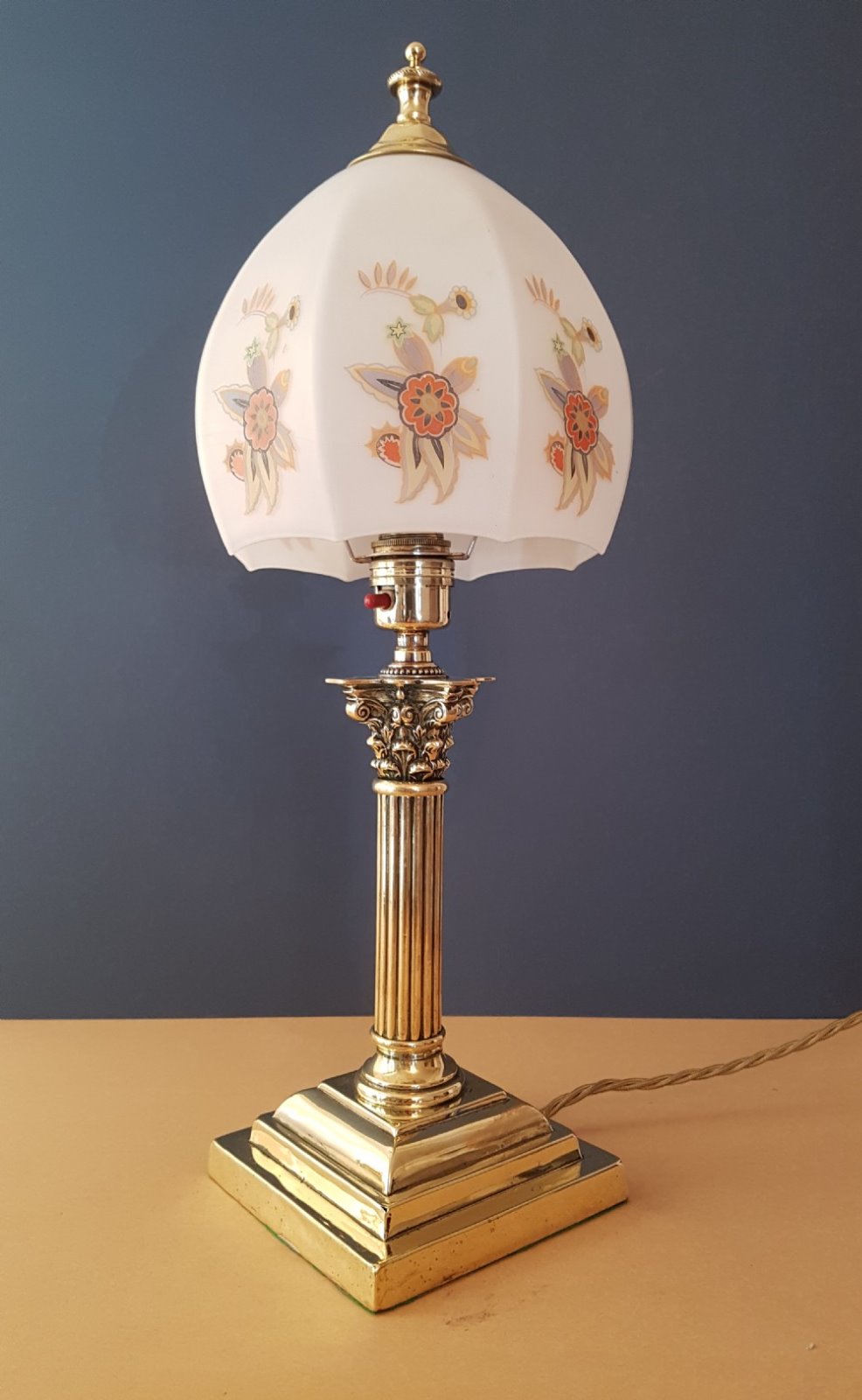 Brass Corinthian Column Table Lamp with Flower Ceramic Shade c.1910