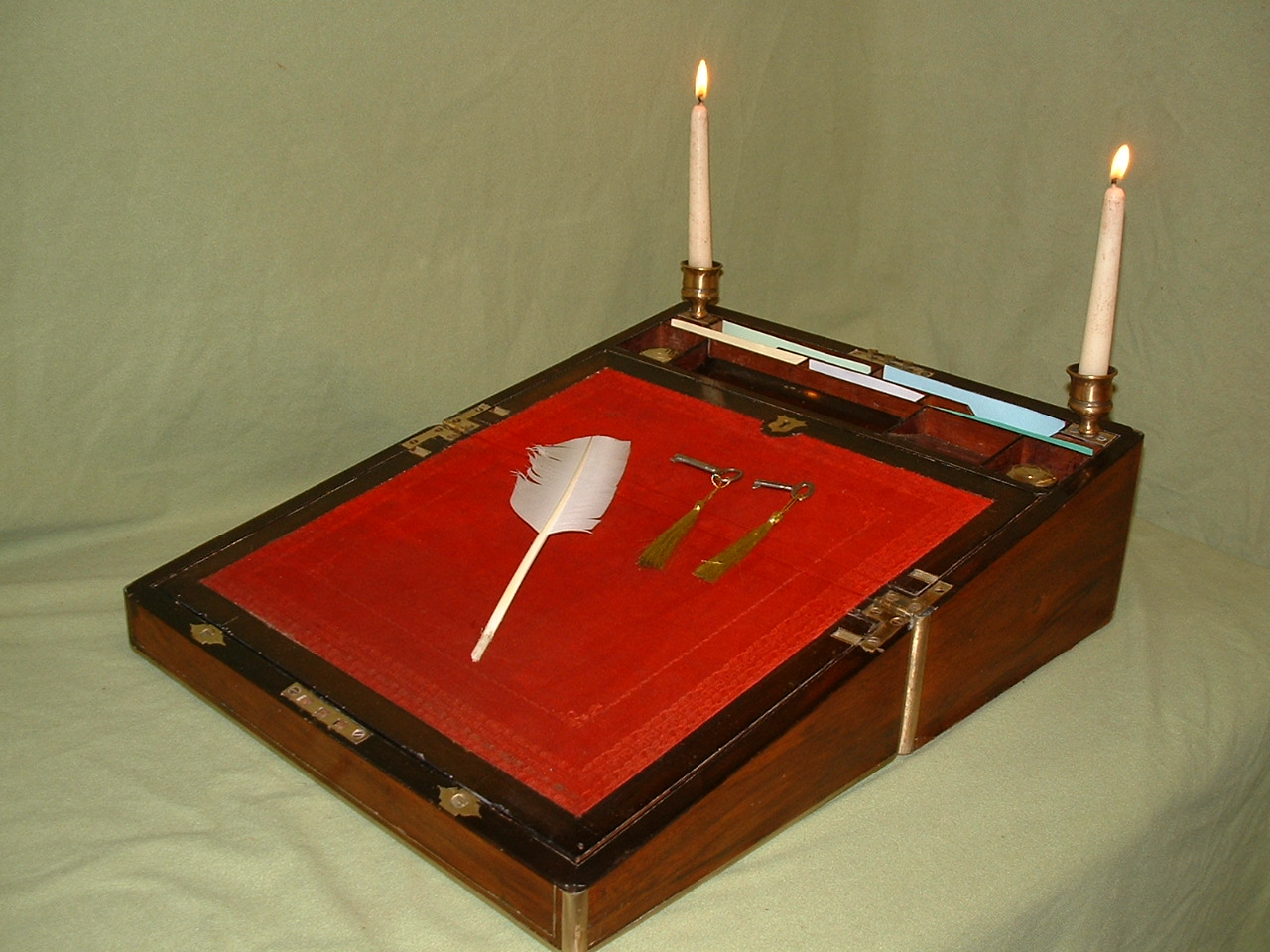 Brass Edge Bound Walnut Writing Box. Many Features + Candle Sconces c.1870