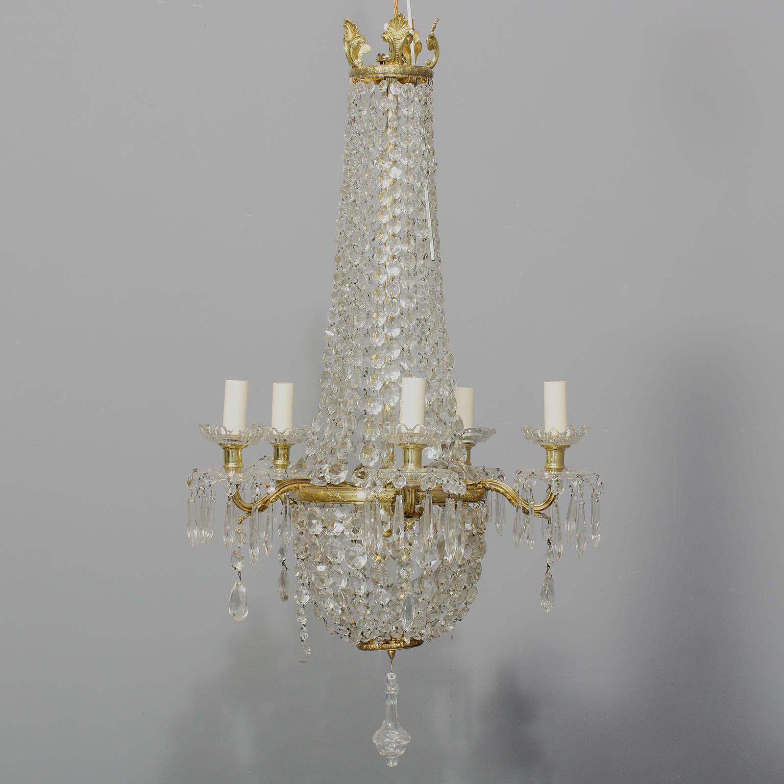 Circa 1930s. A stylish brass and glass chandelier of the tent and basket design, the corona with raised foliate castings and engraved facing supporting graduating spangles of cascading glass to the main circular band which issues five shaped brass arms supporting five lamps, with faux candles, glass nozzles with drip trays draped with elongated glass drops, the bag section with large faceted drops finishing on a small circular bezel with a large downward glass finial, recently cleaned and rewired.