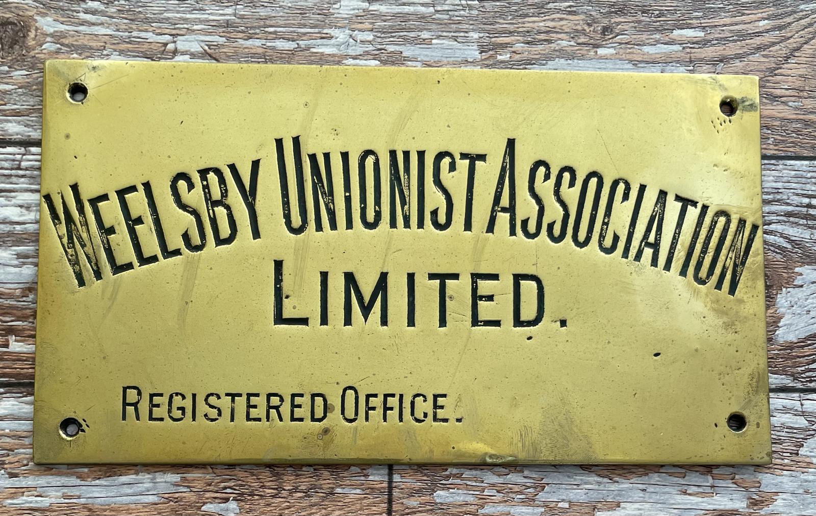 A reclaimed brass sign for the Weelsby Unionist Association Ltd.