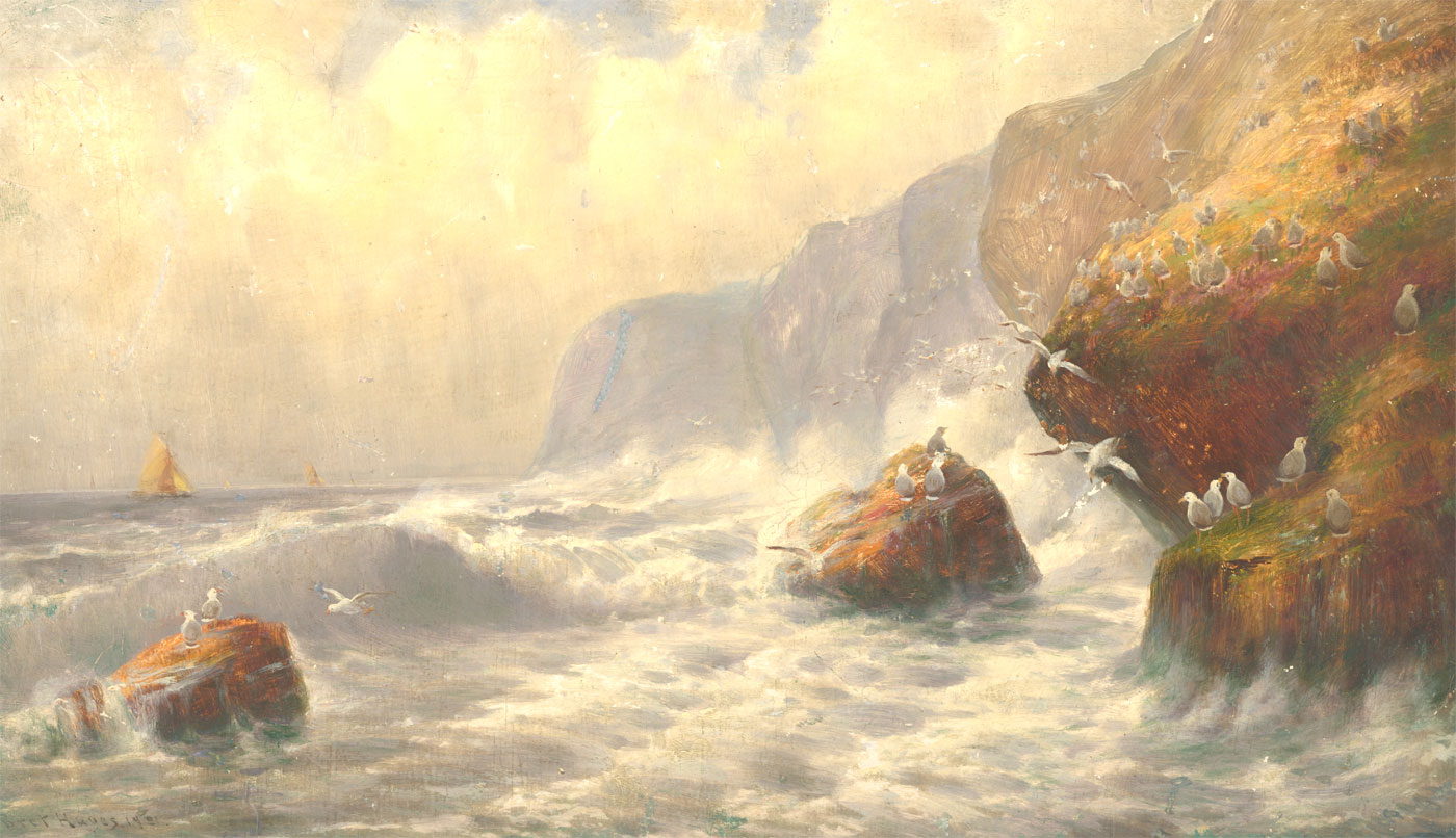 Bret Hayes - 1921 Oil, Gulls in a Dramatic Rocky Coastline
