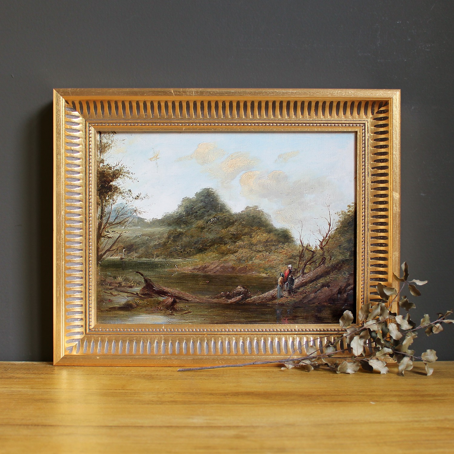 British Landscape Study with River Crossing, Antique Oil Painting, Countryside
