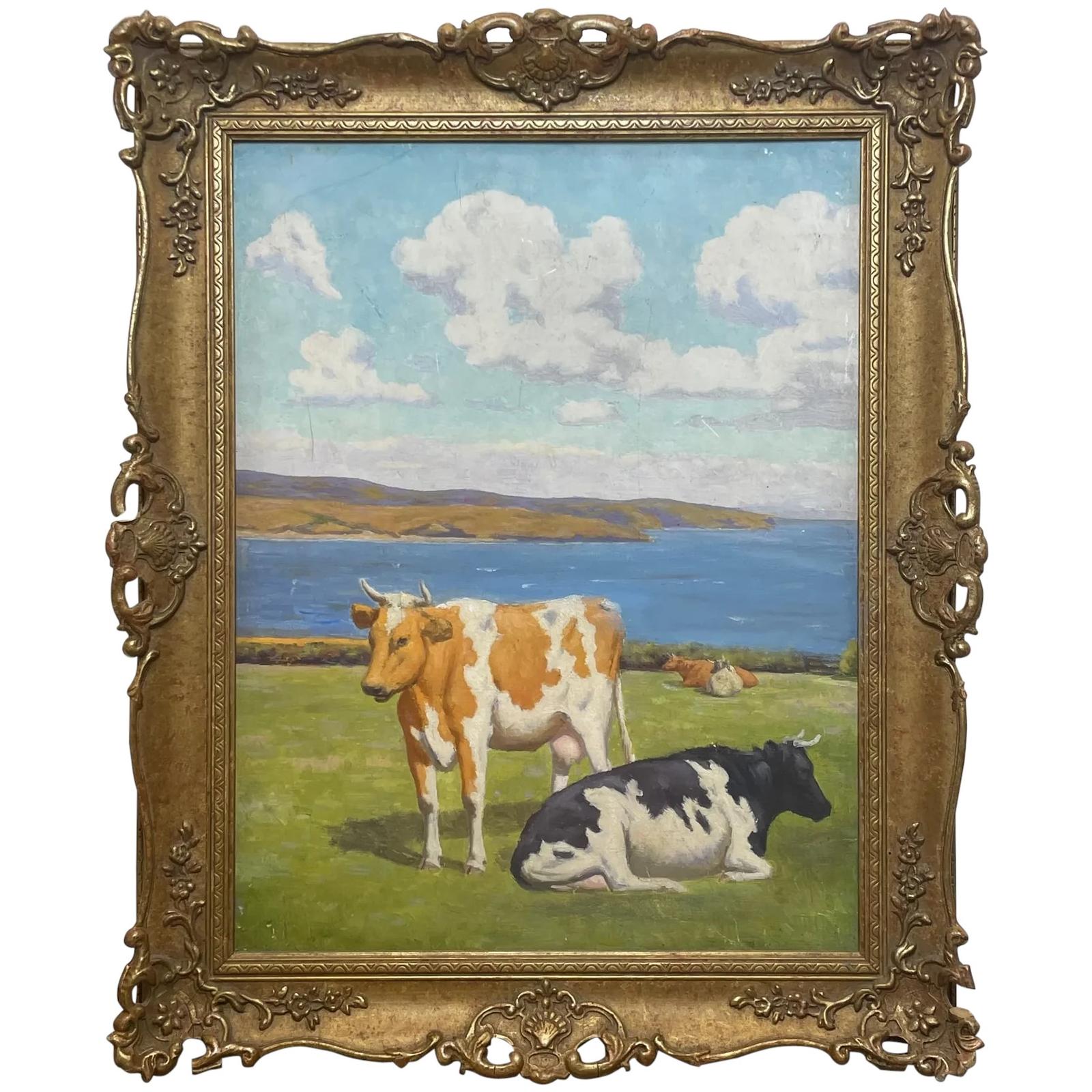 British Oil Painting Cattle by Coast by Ralph Todd RA 1891-1966