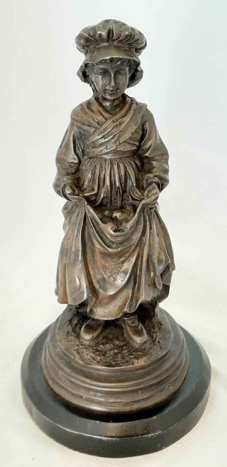 Bronze Figurine of a Victorian Girl in Traditional Dress Carrying Eggs on Wooden Base. Bronze, Antique Gift