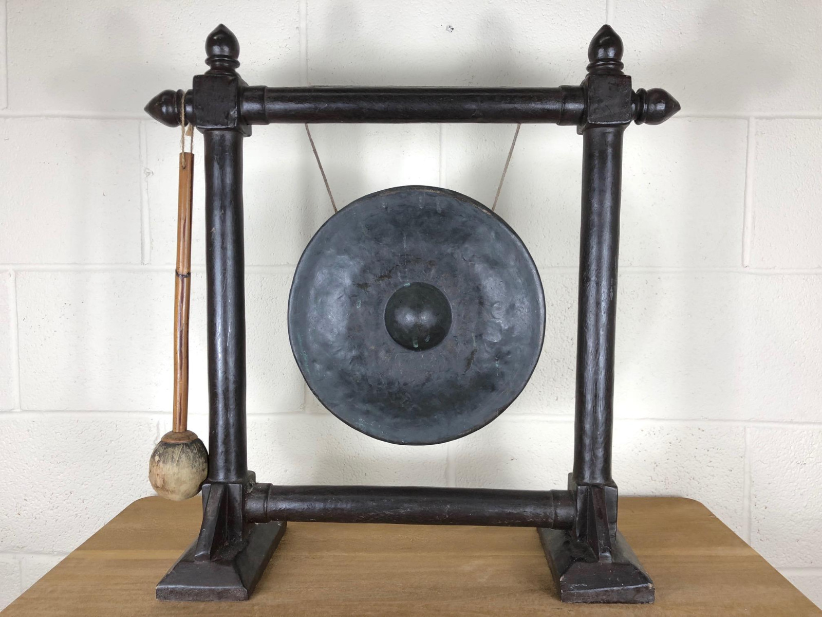 Bronze Table Gong with Hammer On Wooden Frame (1 of 1)