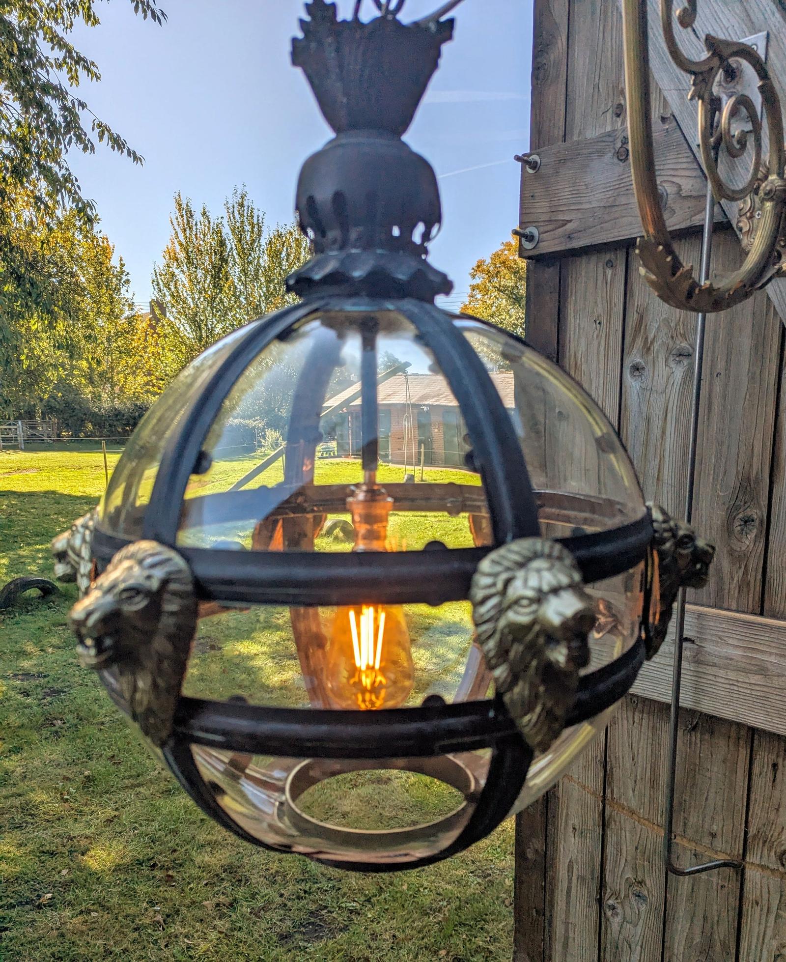 This Bronze Verdigris & Brass Lions Glass Globe Lantern is located in Cheshire, United Kingdom