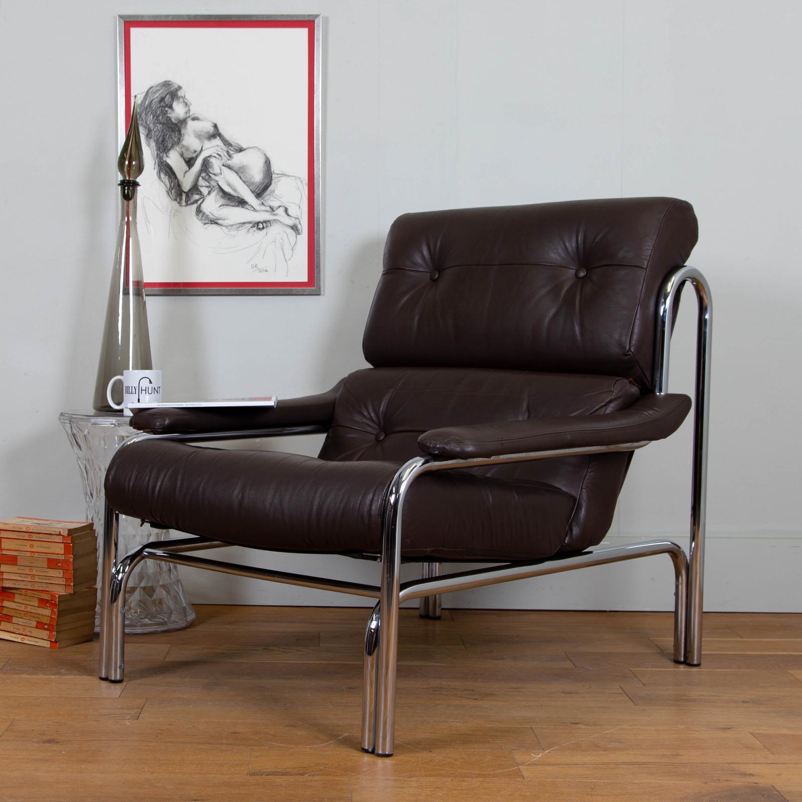 Brown Leather Pieff Chrome Alpha Armchair Mid Century No1
