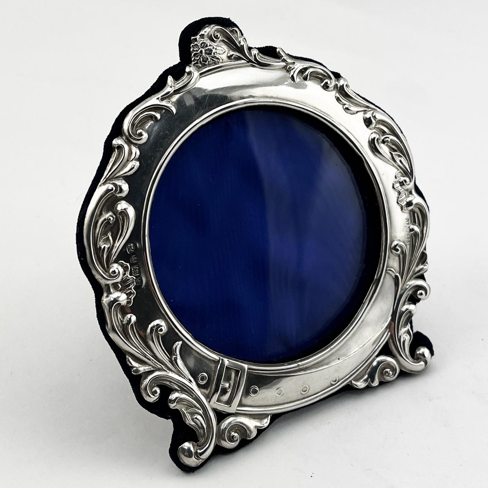 A very charming buckle style antique Edwardian (1903) sterling silver photo frame. In a circular shape with a floral and scroll border and buckle motif. The silver border is in very good condition and the easel back has been beautifully restored with dark blue velvet.