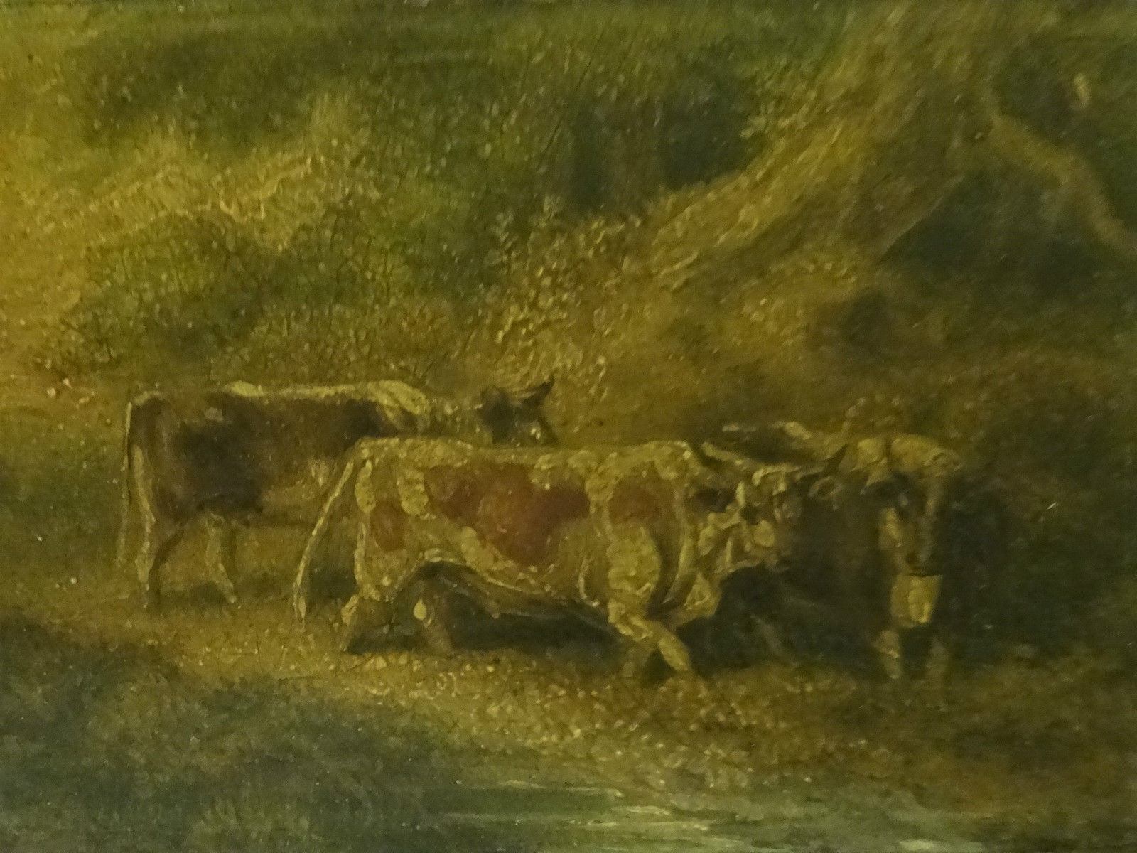 'Bull & Cattle' Beautiful Period 19th Century Miniature Oil On Mahogany Panel Painting
