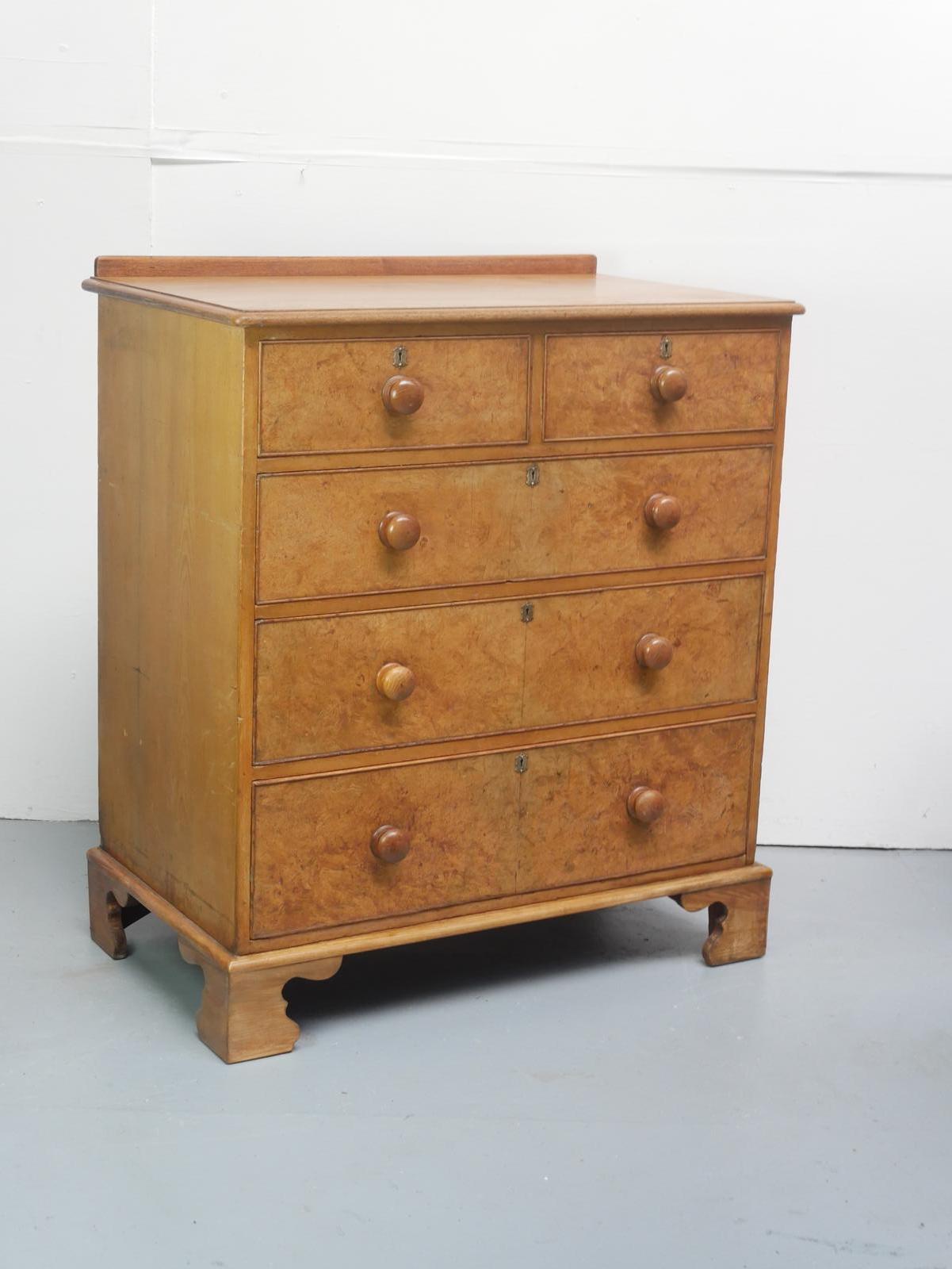 This burr ash chest of drawers dates to around 1850, featuring a traditional design with three long and two short drawers above, original handles, finished with a neat gallery to the back. The chest has free running drawers, well chosen burr ash, known for its distinctive grain patterns, a warm honey colour, ready to use and enjoy.