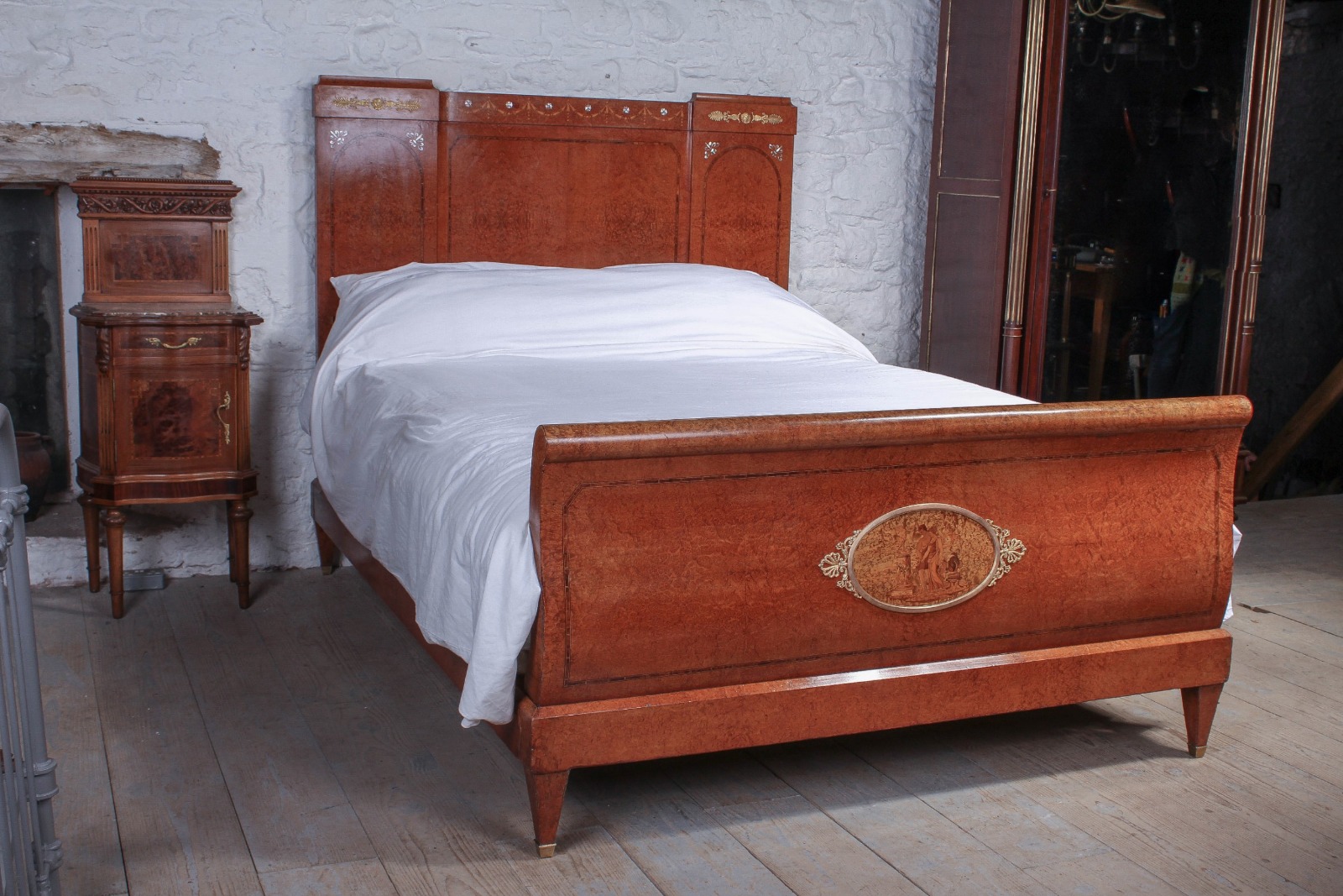 Burr Elm 1920s King Size Bed with Very Pretty Mother of Pearl Inlay Decoration in Headboard (1 of 1)