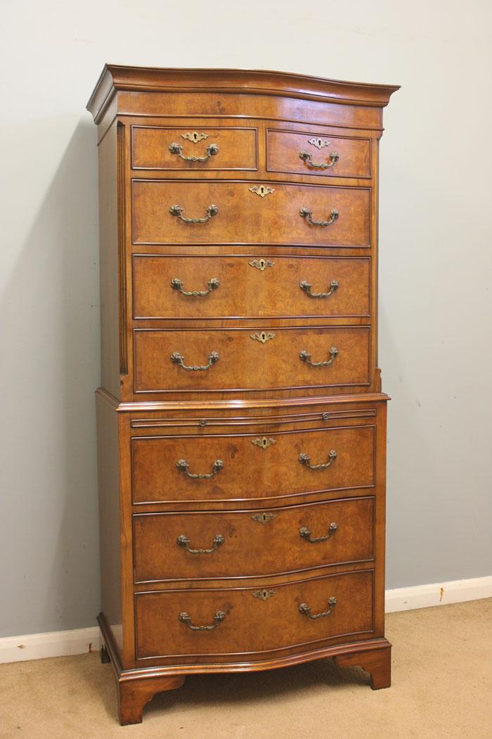 Burr Walnut Antique Tallboy Chest on Chest of Drawers