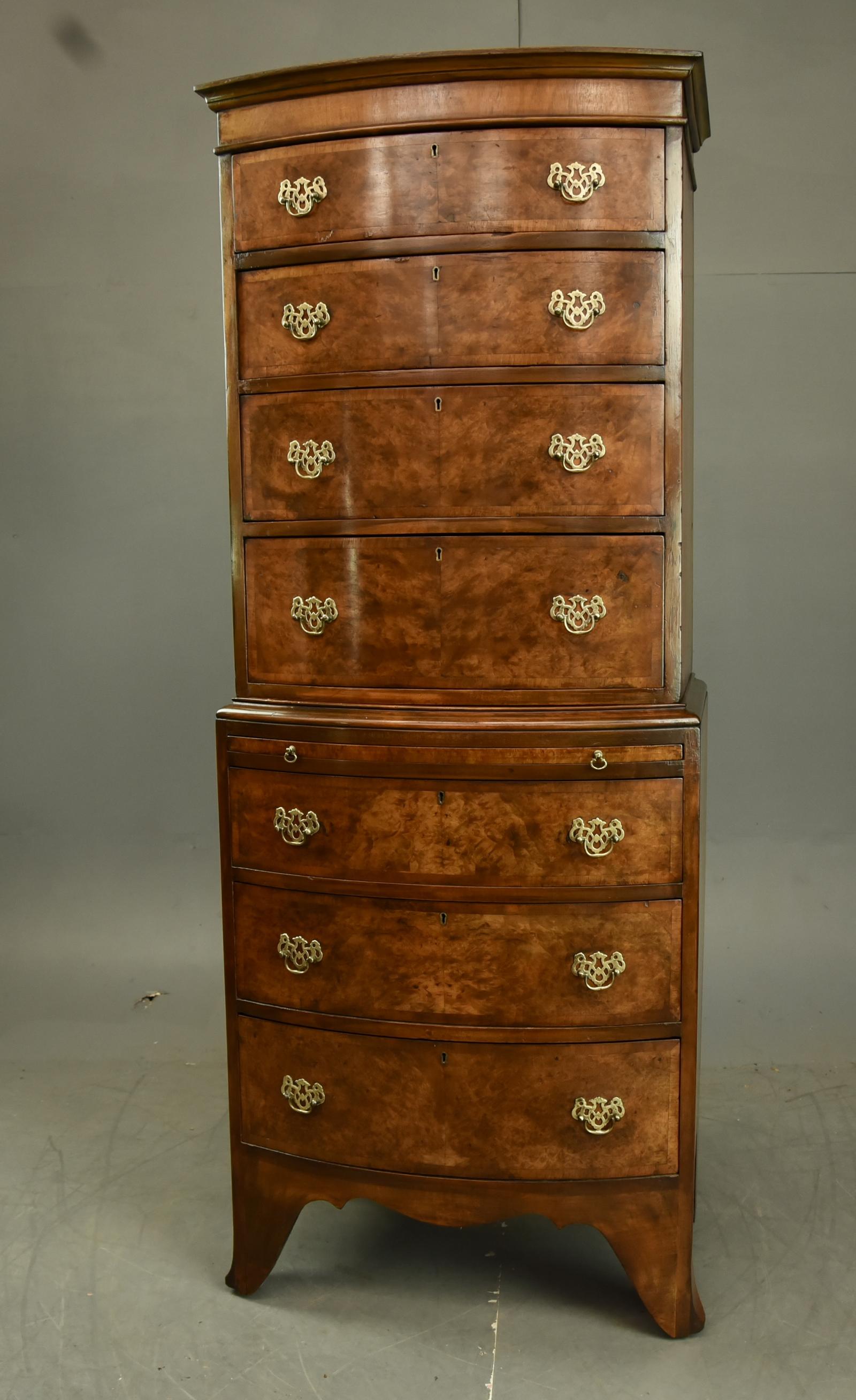 Burr Walnut Bow Front Tallboy Chest on Chest