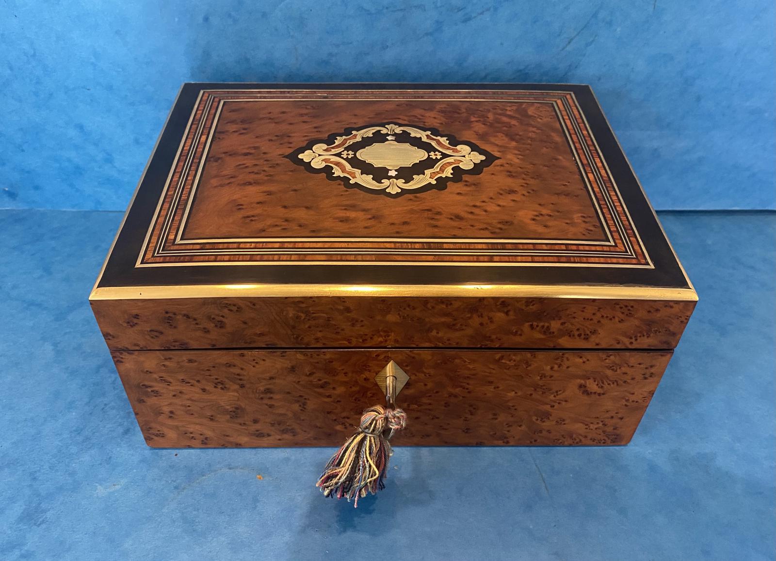 Burr Walnut Brassbound & Brass Inlaid Jewellery Box With Inlay