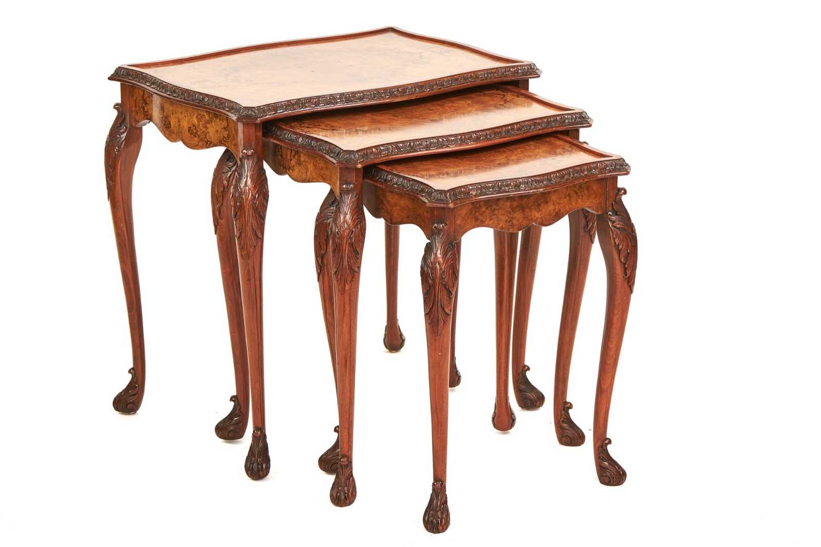 Burr Walnut & Carved Nest of 3 Tables c.1930
