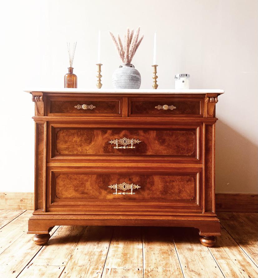 Burr Walnut Chest of Drawers / French Antique Style Commode with Marble