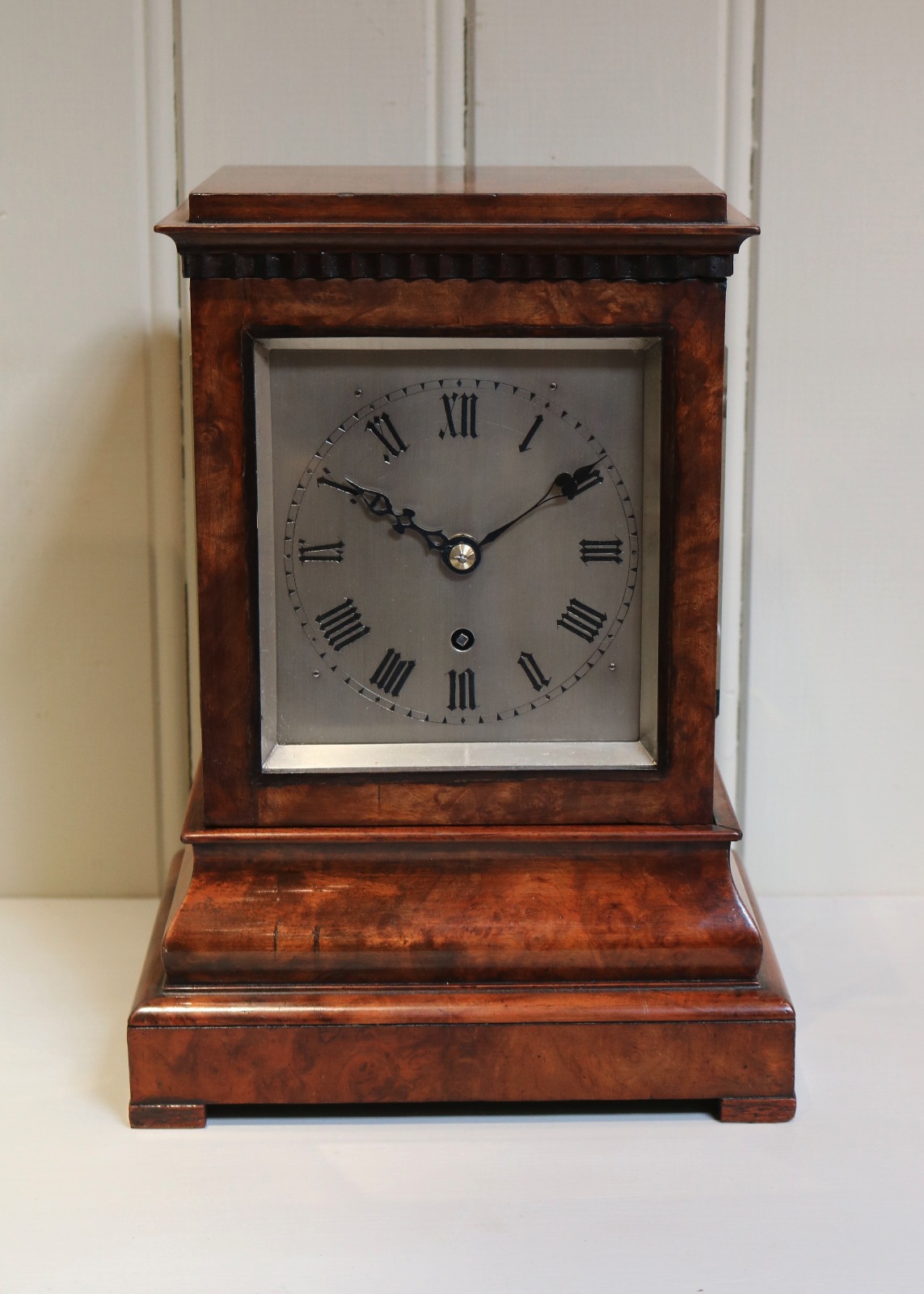 Burr Walnut Four Glass Library Timepiece Bracket Clock, England c.1860