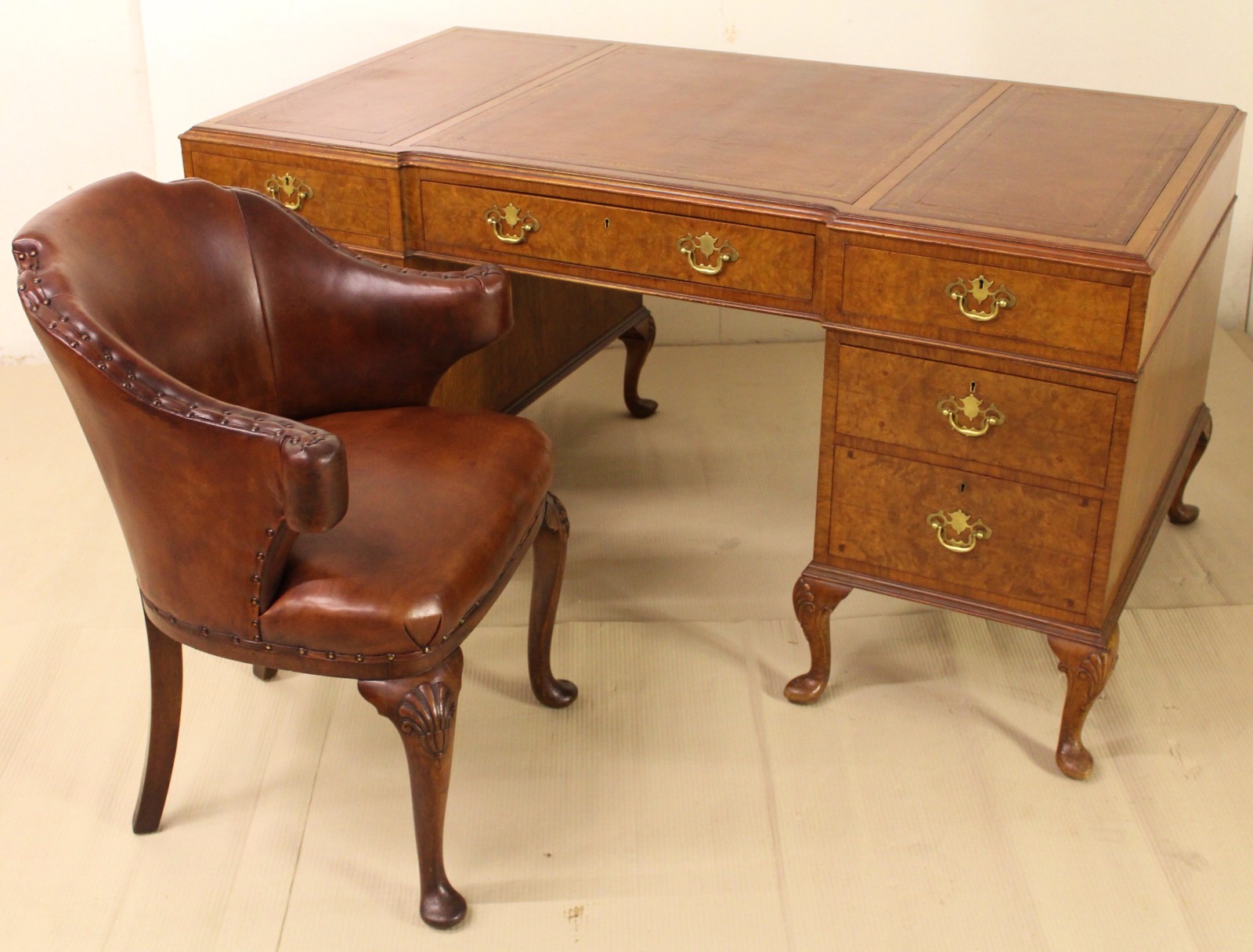 Burr Walnut Pedestal Desk & Matching Chair c.1910