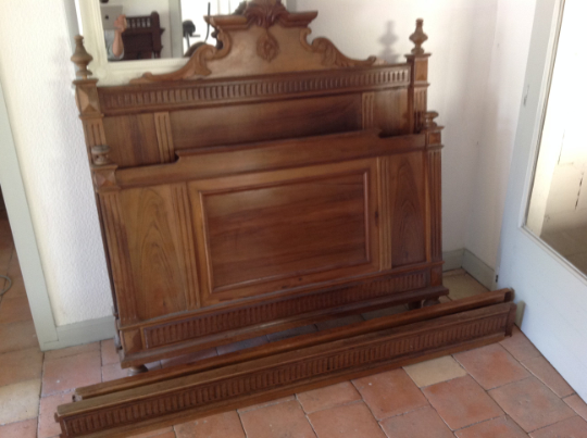 C19th French Antique Solid 4'6" 140 Cm Walnut Chateau Bed Amorial Queen Size Double Queen Bed