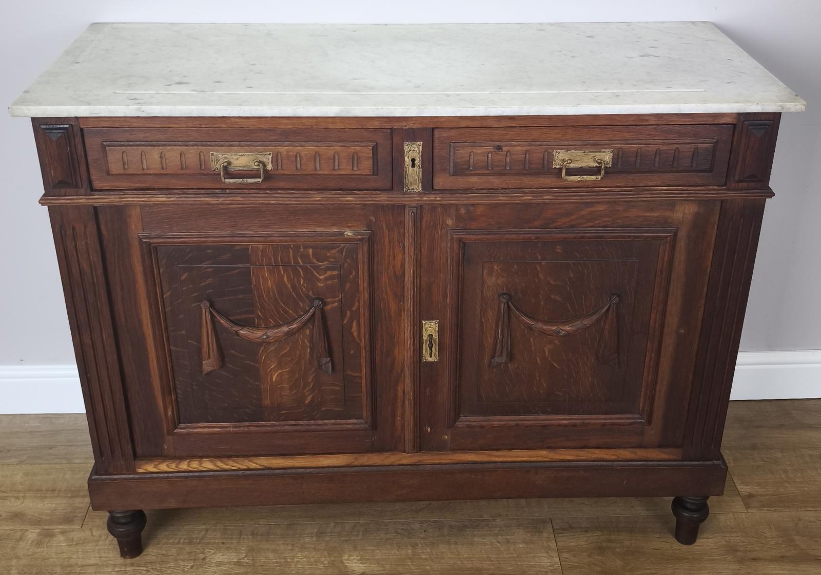 Crafted in walnut, this cabinet displays a rich, warm grain complemented by a smooth marble top that adds a touch of luxury. The panelled doors feature subtle carved detailing with decorative drapery-style motifs, while the brass handles and escutcheons enhance its traditional French aesthetic. The interior reveals spacious shelving, ideal for organised storage.