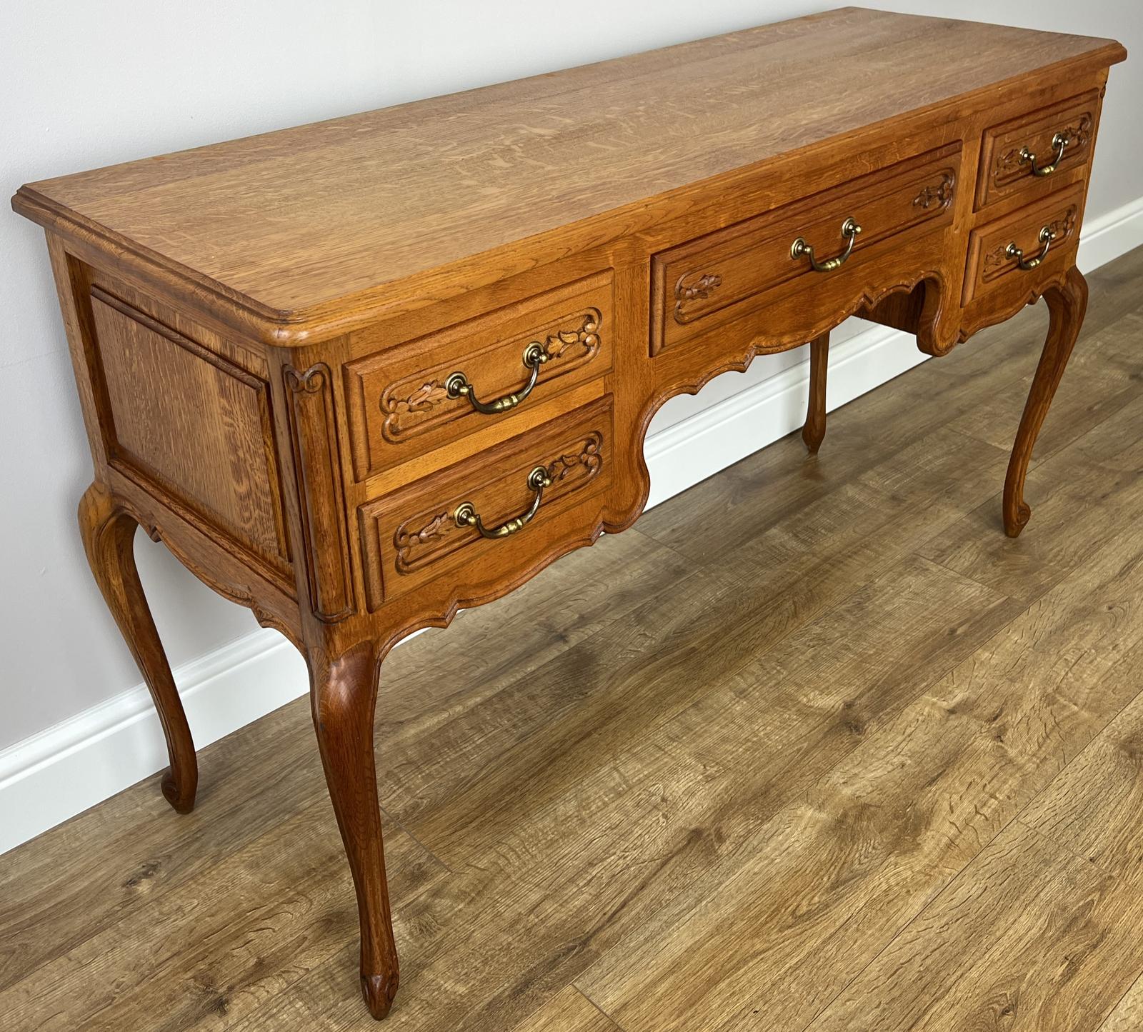 A charming vintage French Louis cabinet showcasing elegant craftsmanship and timeless French design. The piece features graceful cabriole legs, beautifully carved drawer fronts and classic brass handles, all enhanced by a warm oak finish that highlights the natural beauty of the wood grain.