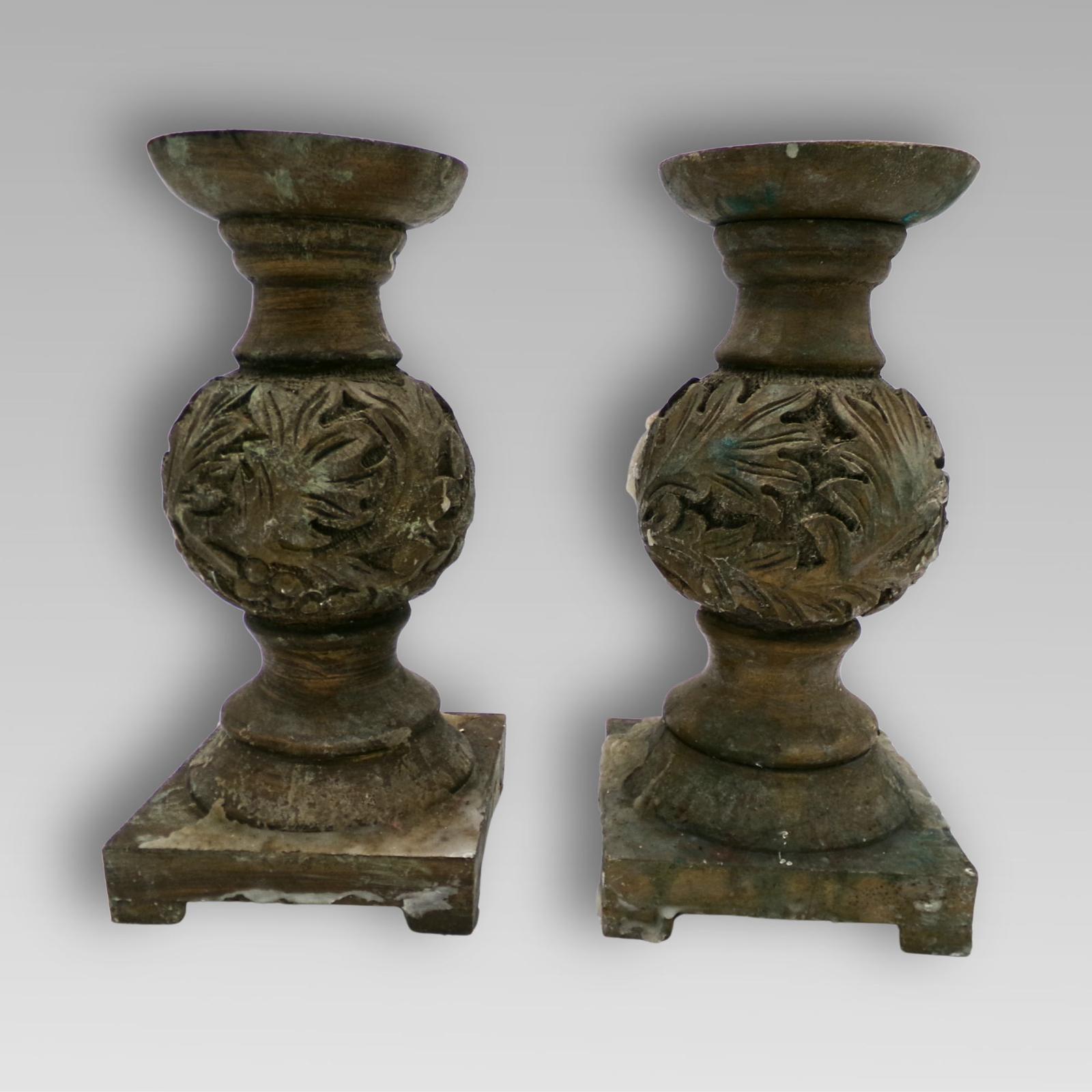 Candlesticks Carved Wooden Fabulous Vintage Indian Hand Carved Bulbous Acanthus Leaf Pair of Candlesticks