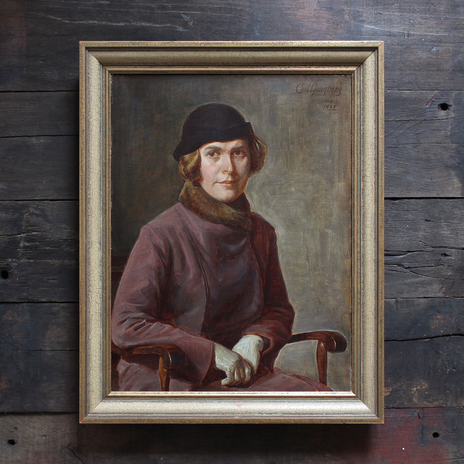 Carl Ljungberg, Portrait of a Seated Lady with a Purple Coat, 1930's Swedish Oil Painting