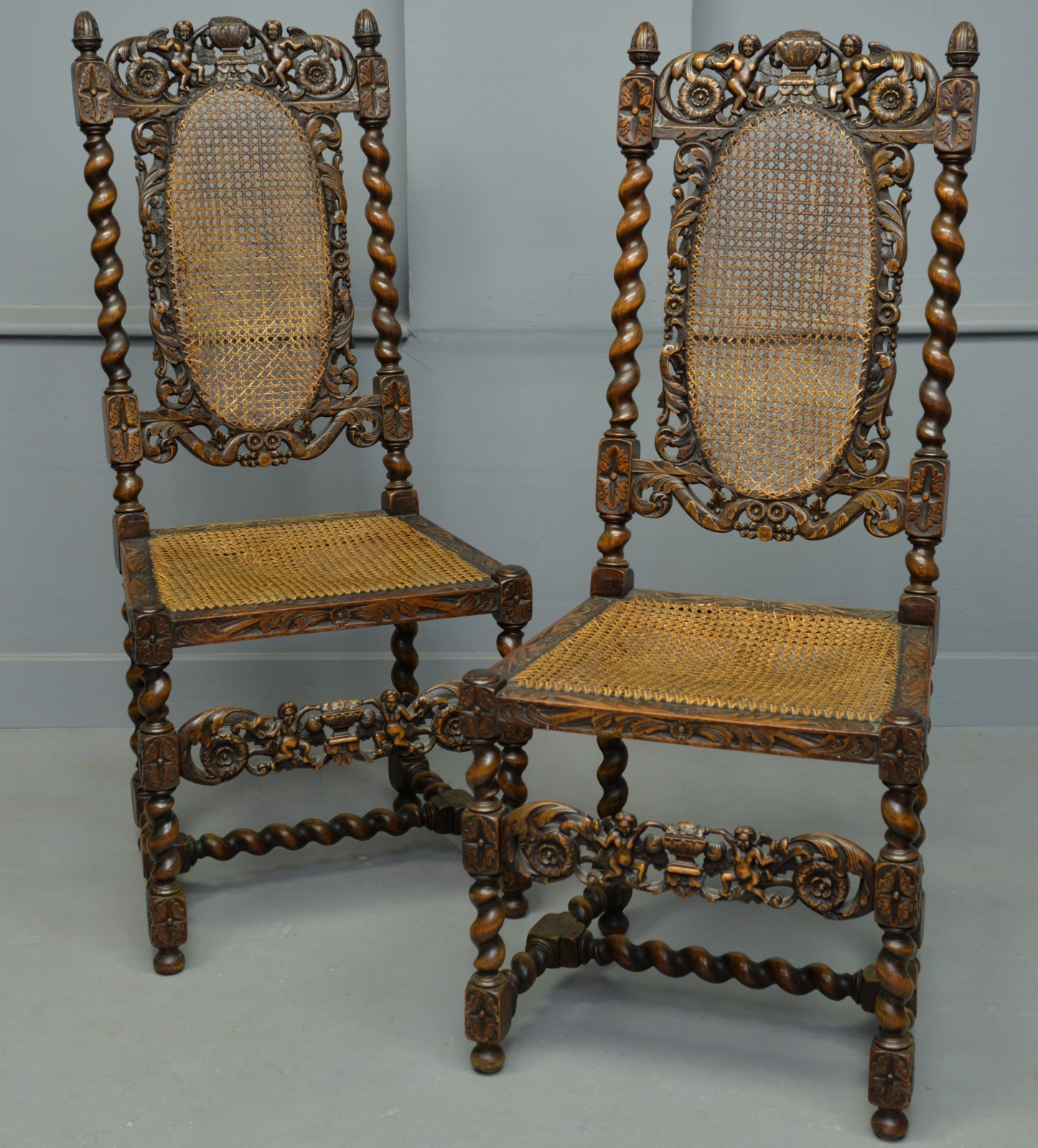 Carolean Revival Pair of Carved Oak Side Hall Chairs