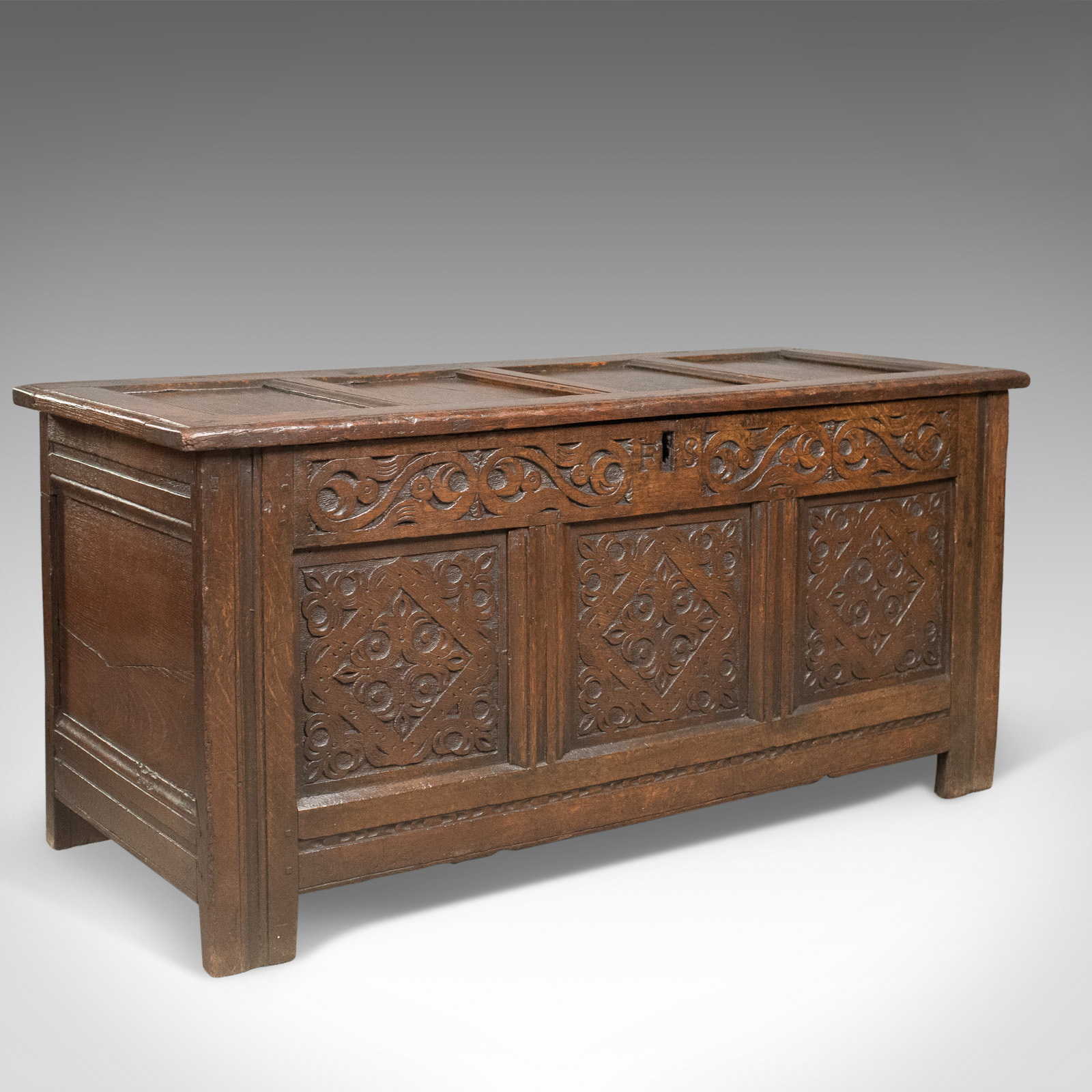 Carved Antique Coffer, English Oak Joined Chest, Trunk c.1700