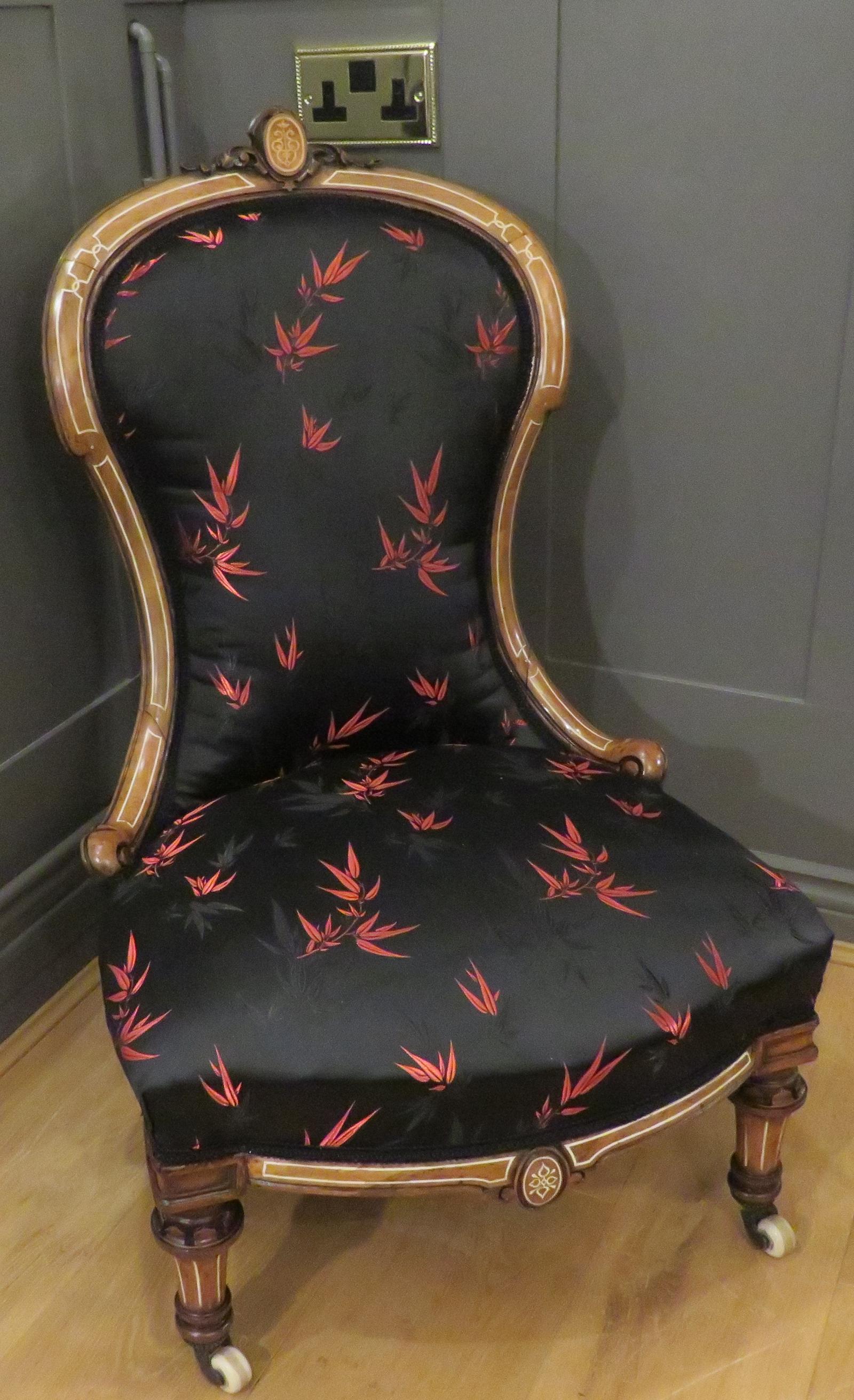 Carved Inlaid Walnut Ladies Armchair Restored & Upholstered