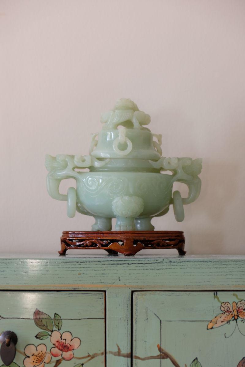 Carved Jade Twin Dragon Handled Tripod Incense Censer