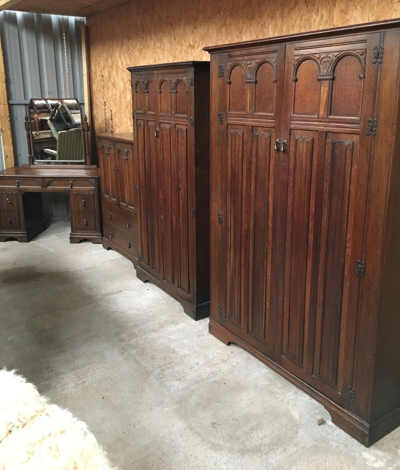 Carved Oak Bedroom Suite Wardrobe / Dressing Table / Tallboy c.1950