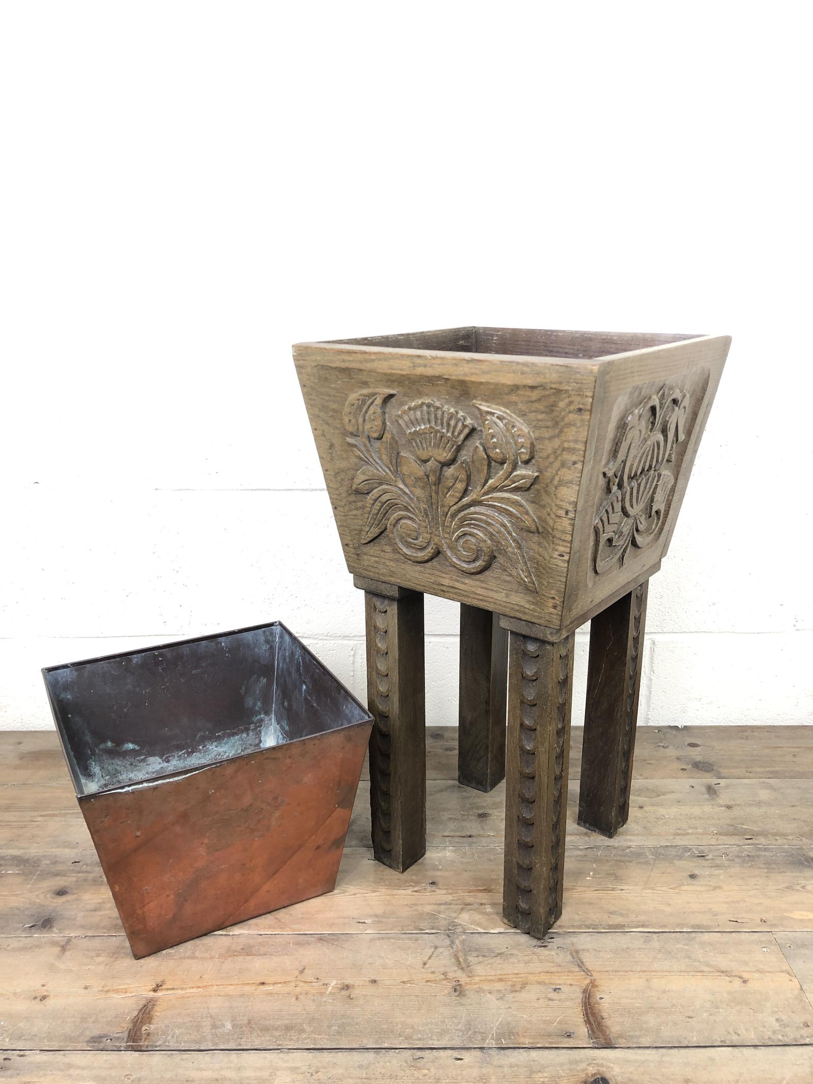 Carved Oak Plant Stand with Metal Liner (1 of 7)