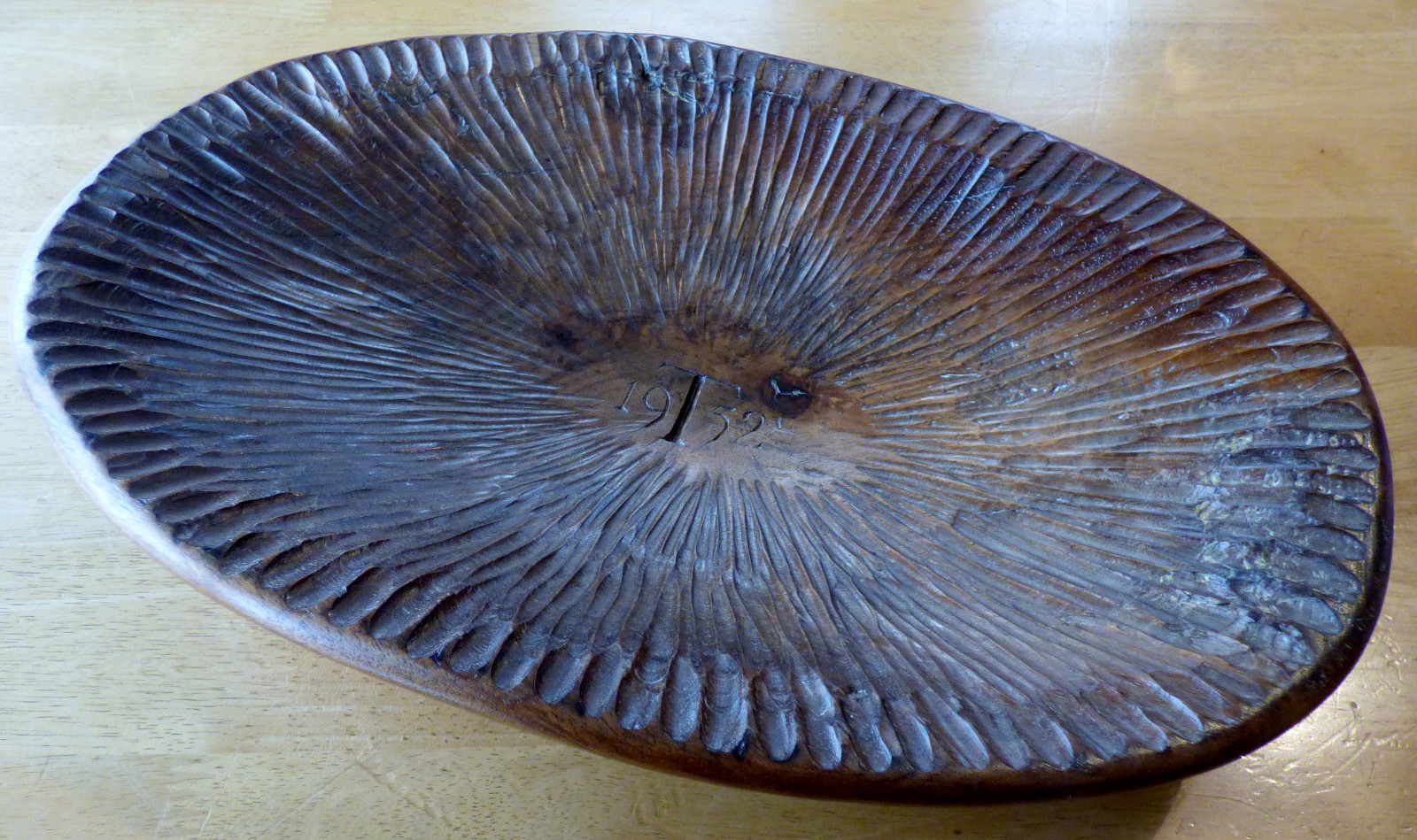 Carved Treen Bowl with Fluted Interior, Signed and Dated 1952