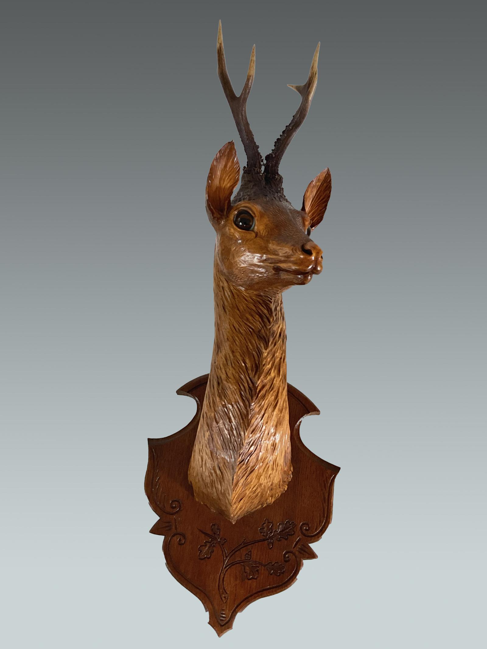 Carved Wooden Roe Deer Head on Shaped Wooden Mount