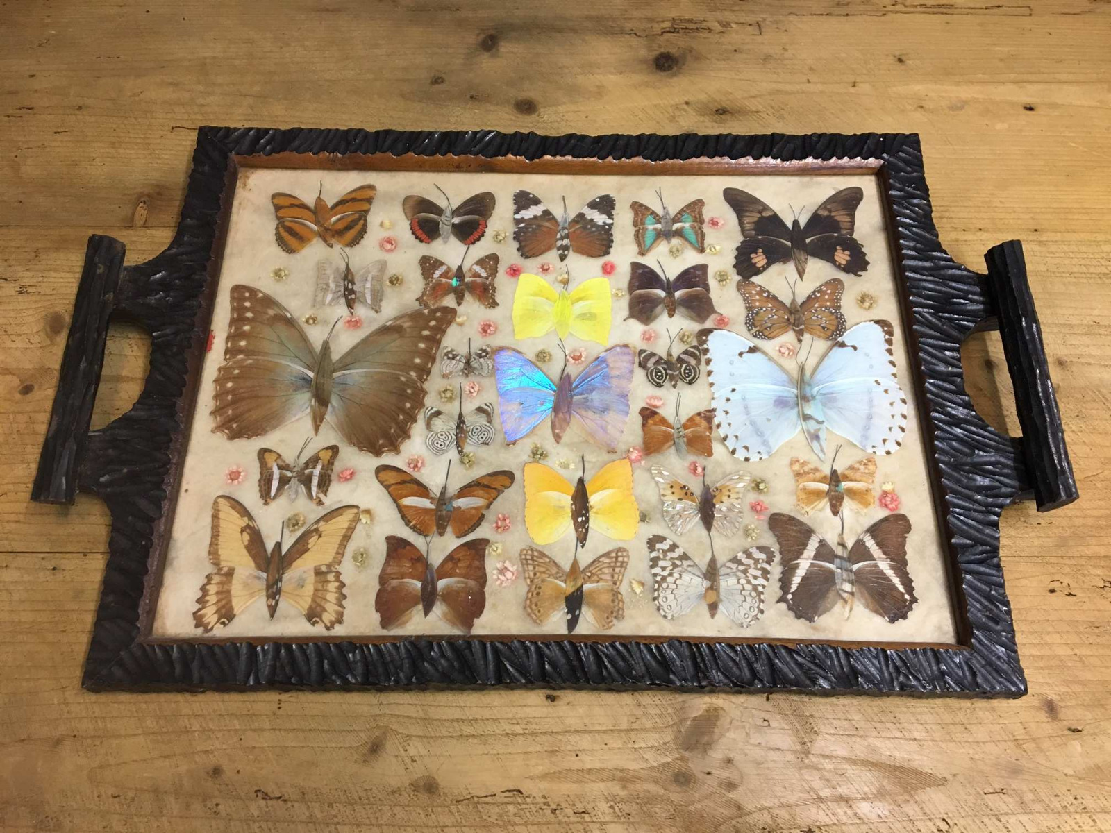 Carved Wooden Tray with Inset Pressed Butterflies C.1920 (1 of 1)