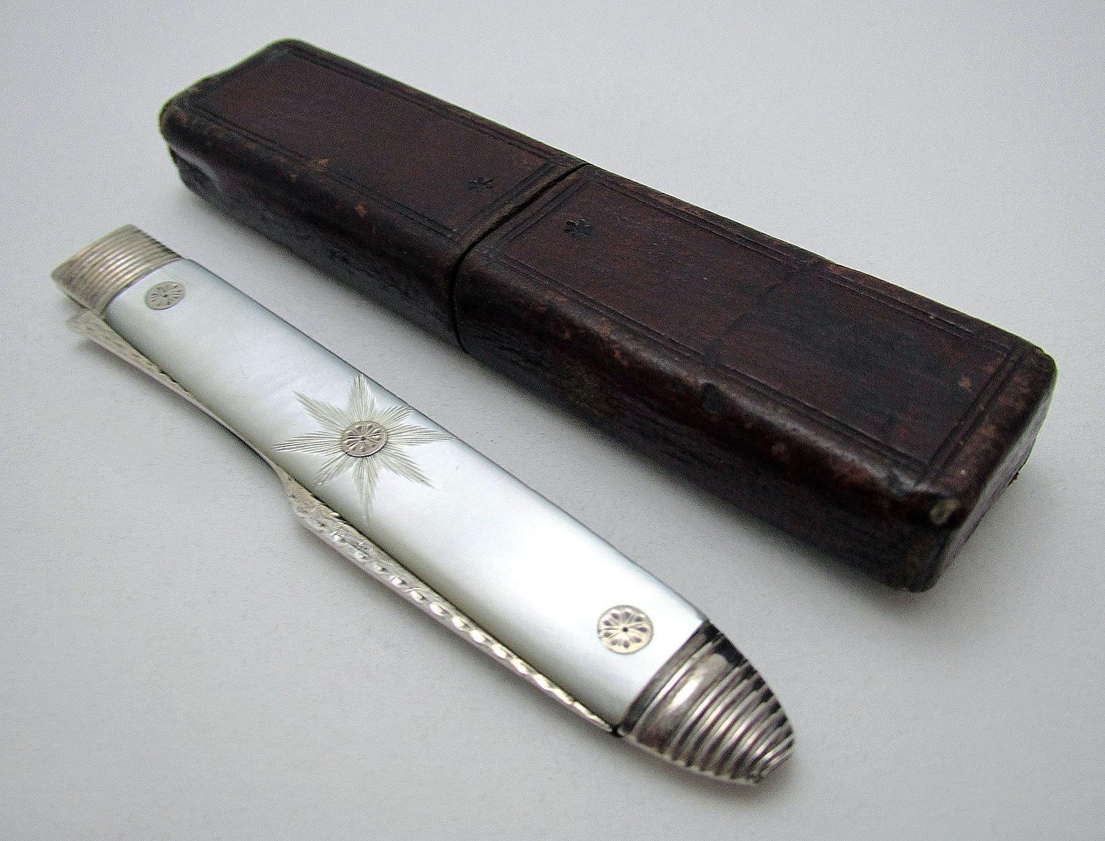 Cased Antique George III Sterling Silver & Mother of Pearl English Georgian Bright-cut Folding Fruit Fork
