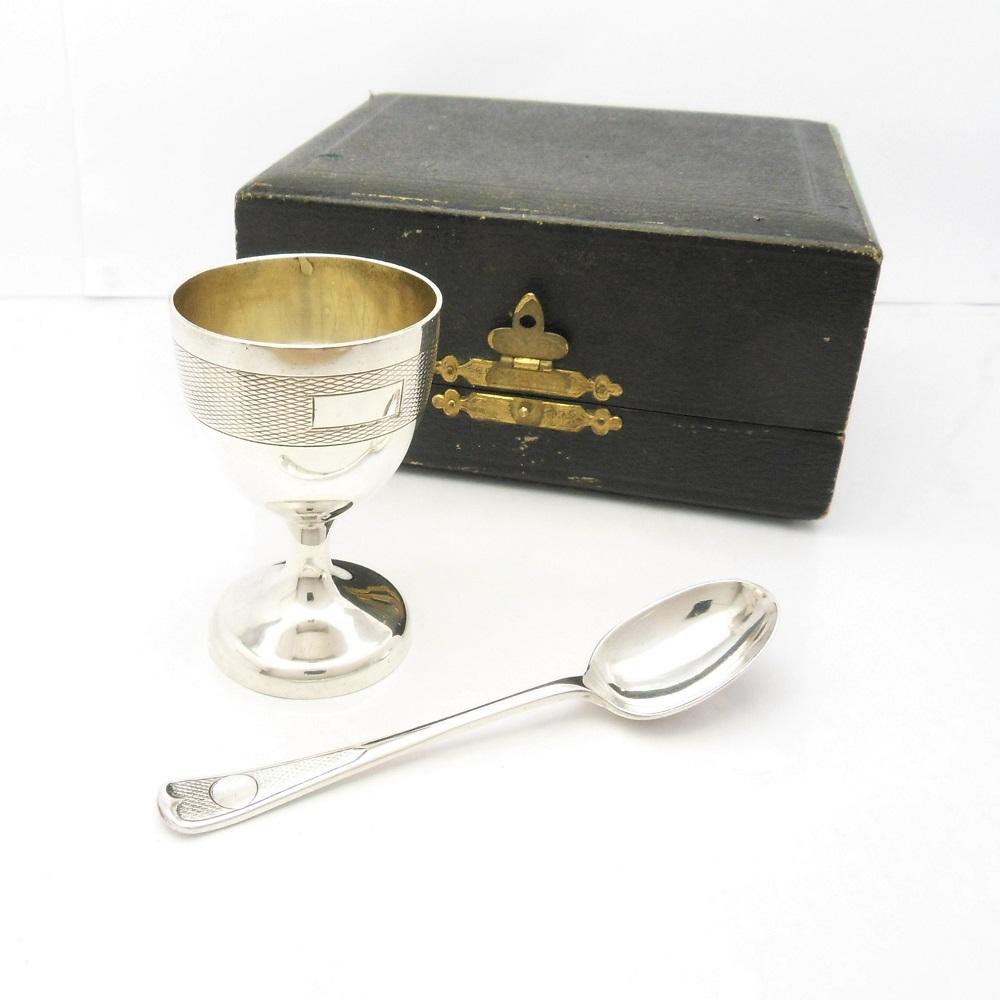 Cased Art Deco Silver Egg Cup and Spoon Christening Set