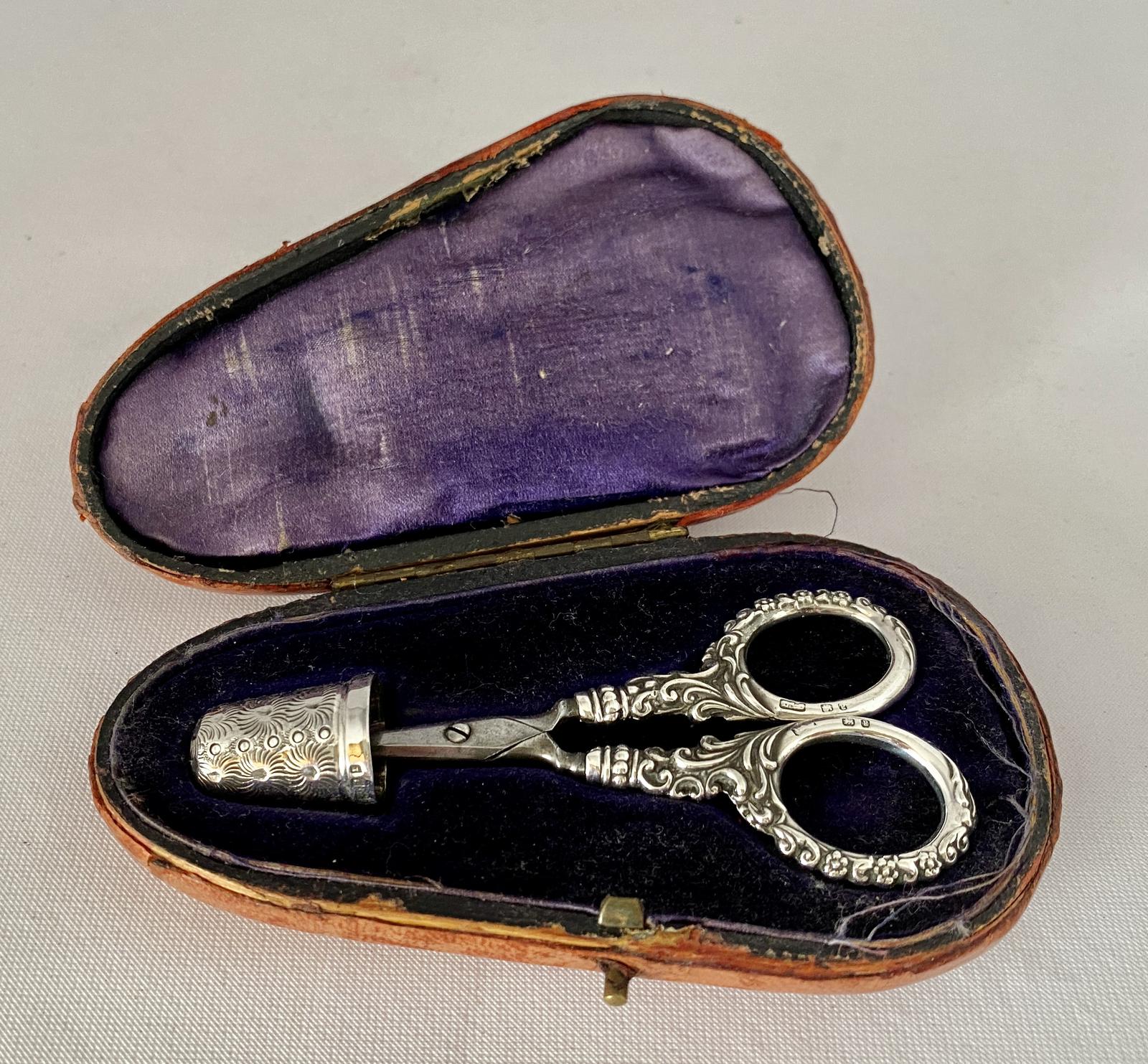 Cased Needlework Scissors & Thimble - Birmingham 1881