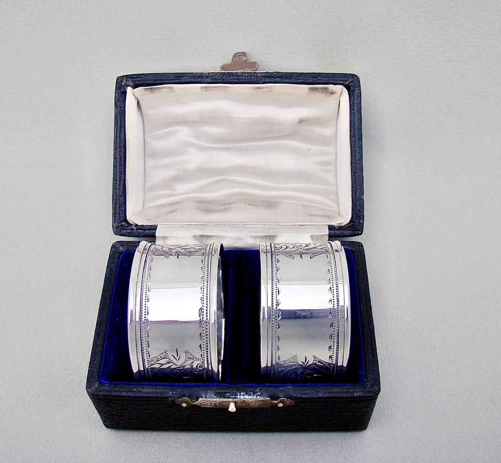 Cased Pair of Edwardian Engraved Silver Napkin Rings by The Rolason Broterhs, Chester 1903