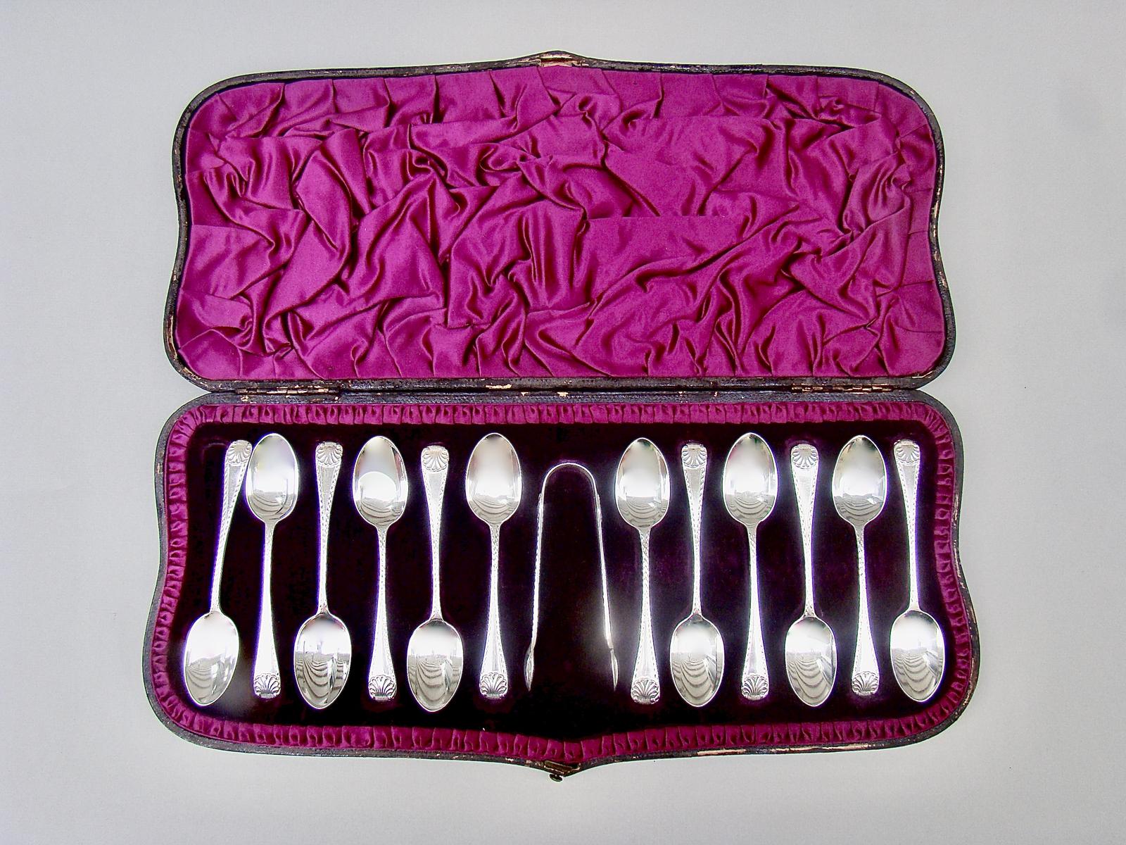 Cased Set of 12 Victorian Teaspoons & Matching Sugar Tongs by Wakely & Wheeler, London 1889