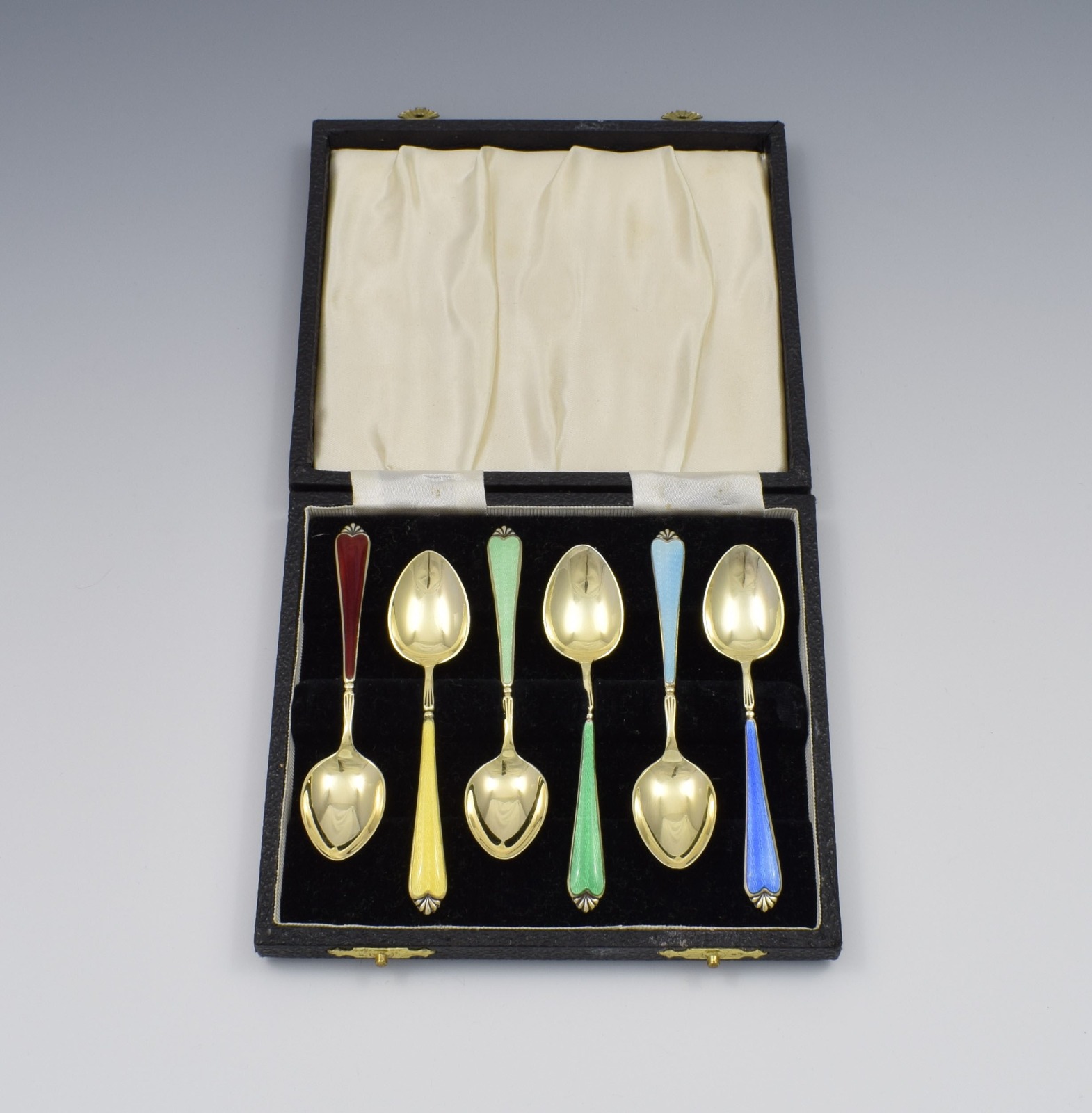 Cased Set of 6 Silver Gilt & Guilloche Enamel Rainbow Teaspoons (1 of 1)