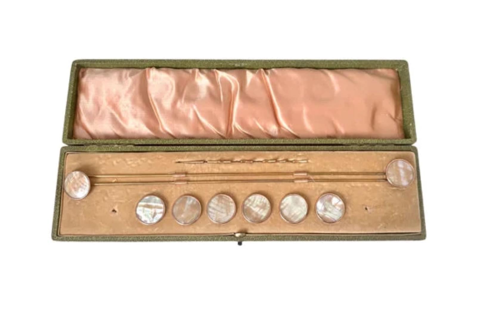Cased Set of Antique Mother of Pearl Hat Pins and Button Set c.1910