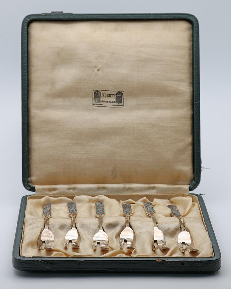Cased Set of Liberty Silver and Enamel Pastry Forks (1 of 5)