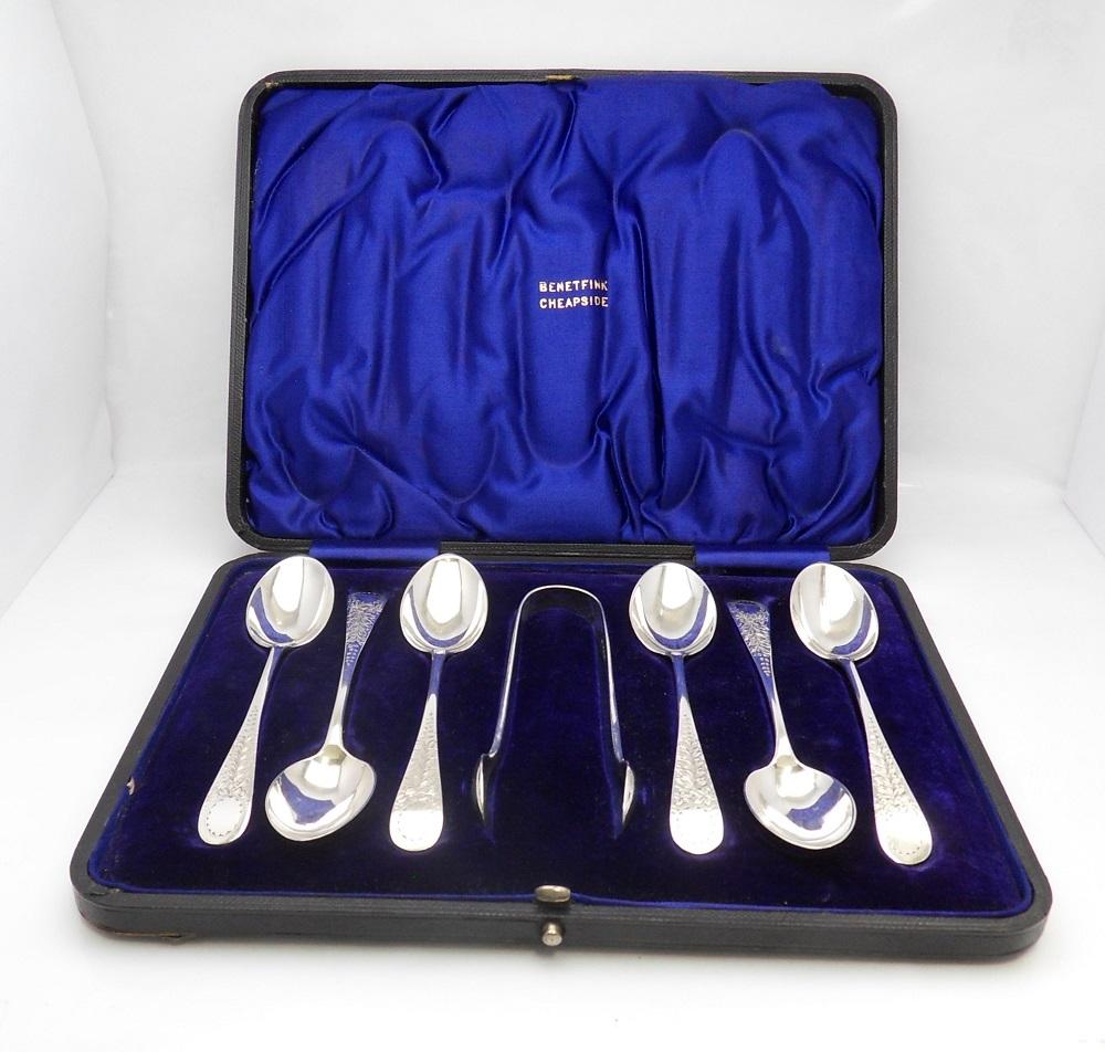 Cased Set of Silver Teaspoons & Sugar Tongs - Sheffield 1899