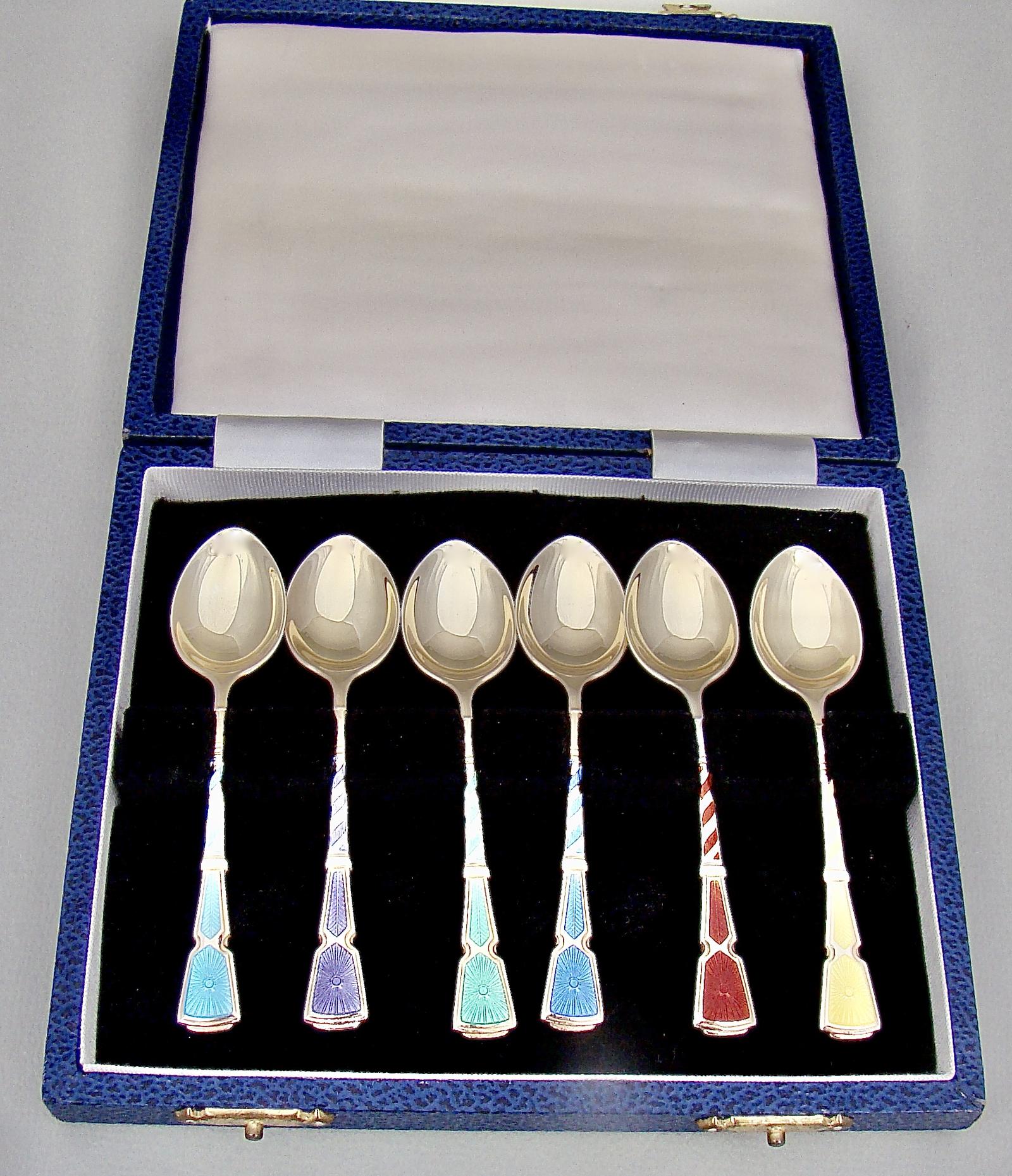 Cased Set of Six Mid Century Guilloche Enamel Coffee Spoons by Turner & Simpson, Birmingham 1971