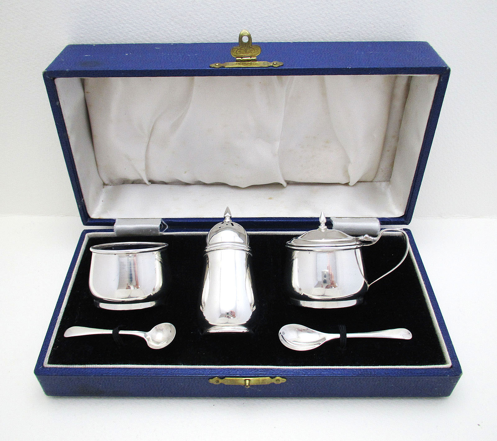 Cased, Three-Piece Solid Sterling Silver Salt Cellar, Pepper, Mustard Pot Bowl Shaker Cruet Set + Spoons. Box. Birmingham English Hallmarked